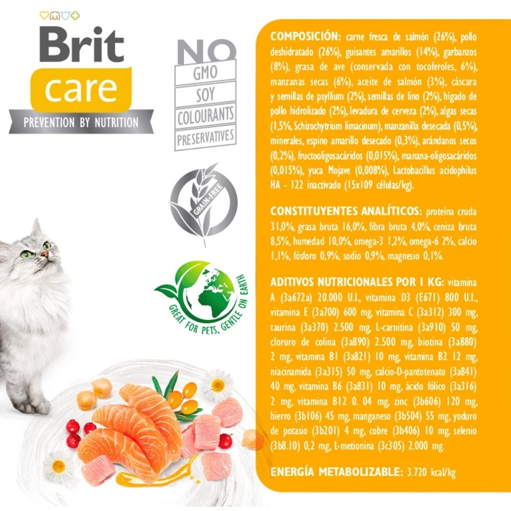 Alimento seco super‑premium sin cereales ni soja, formulado con salmón fresco y pollo. Especialmente diseñado para mantener un pelaje brillante, piel saludable y facilitar el paso de bolas de pelo.