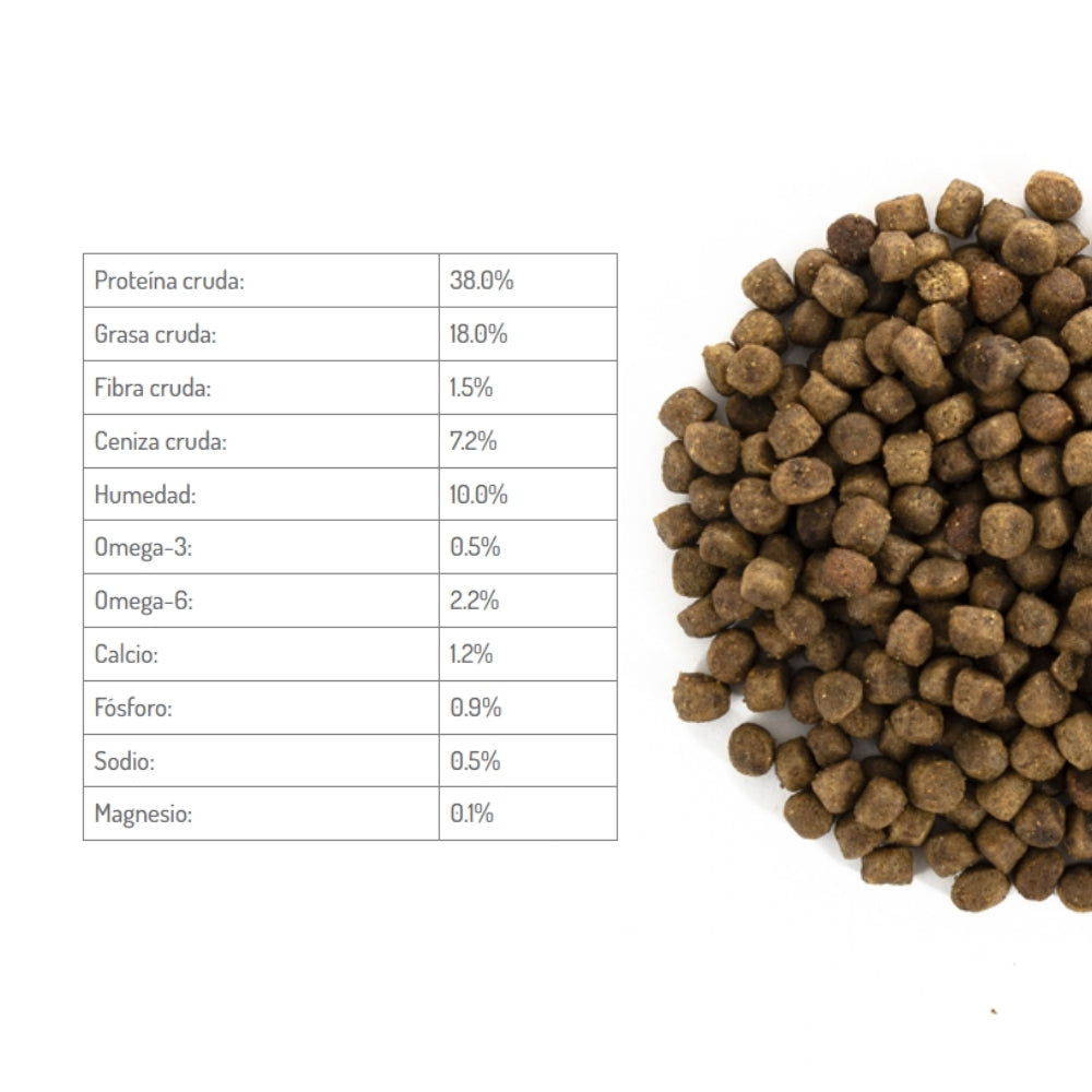 - Crecimiento saludable: proteína 38 % y grasa 18 % proporcionan energía y soporte para músculos, huesos y vitalidad