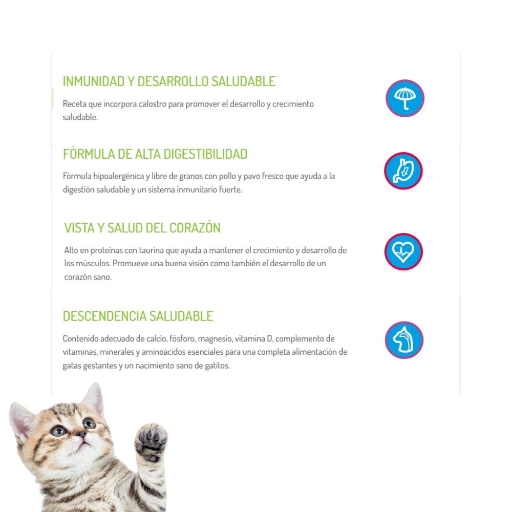 Alimento completo para gatitos de 1 a 12 meses y para gatas gestantes o lactantes. Adecuado para etapas con altas demandas energéticas y protección inmunológica.