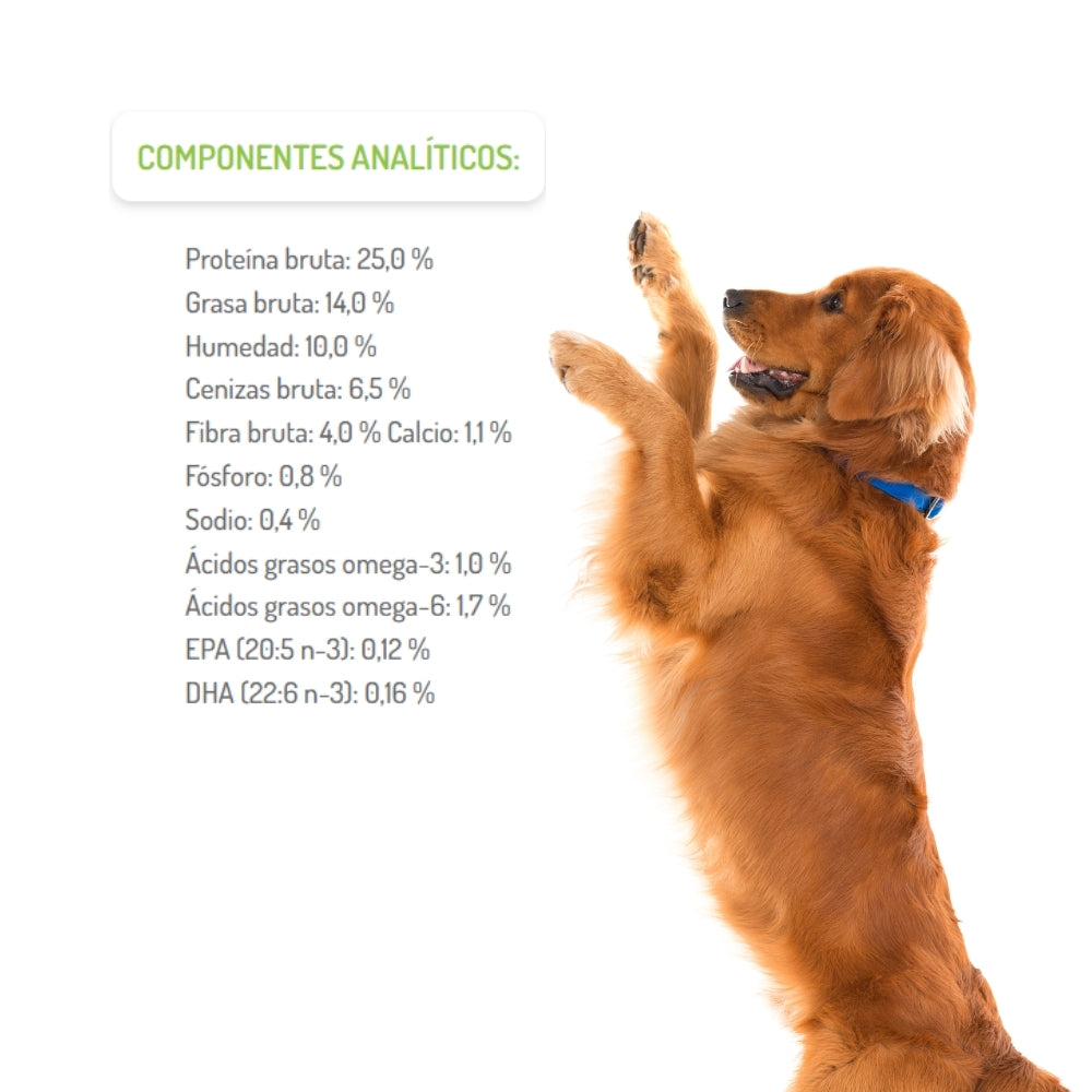 - Ácidos grasos omega‑3 (1 %) y omega‑6 (1,7 %): apoyan salud dérmica, cardiovascular y pelaje brillante.