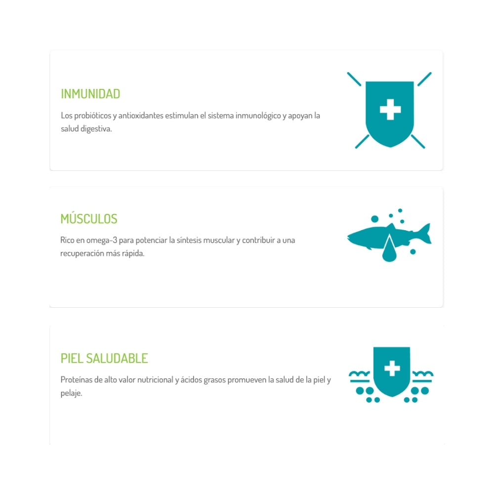 Alimento seco super premium, hipoalergénico y completamente libre de cereales. Con salmón deshidratado como única fuente animal y patata como carbohidrato. Enriquecido con condroprotectores, prebióticos, probióticos y antioxidantes para piel, pelaje, articulaciones, digestión e inmunidad.
