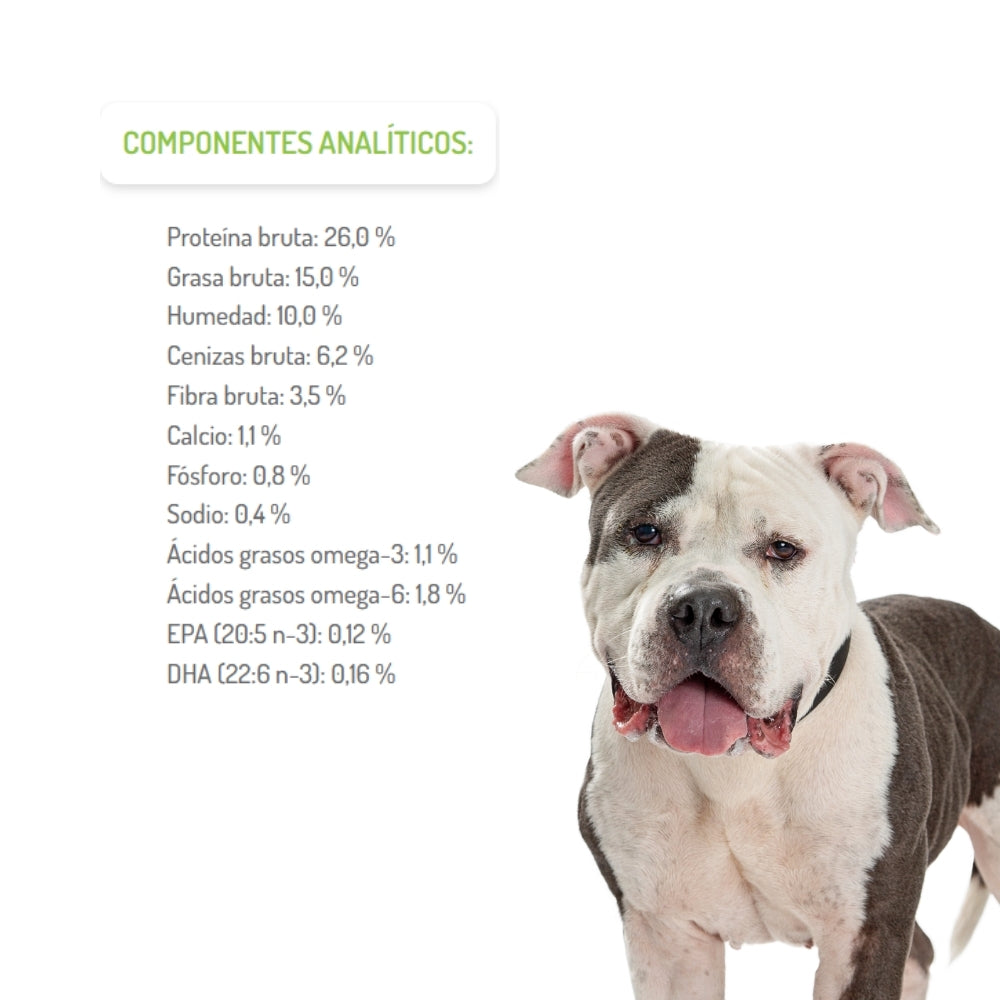 - Energía equilibrada (3740 kcal/kg), proteína 26 %, grasa 15 %: apoya condición física, musculatura y control de peso.