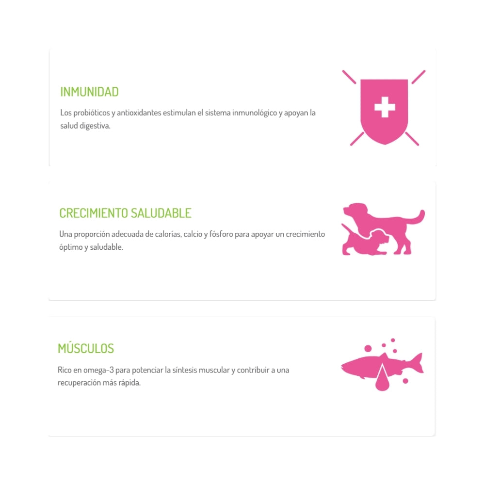 Recomendado para cachorros de todas las razas desde las 4 semanas hasta los 12 meses. Ideal para etapas de crecimiento que requieren nutrición sin cereales, con enfoque en digestión, articulaciones y desarrollo saludable.