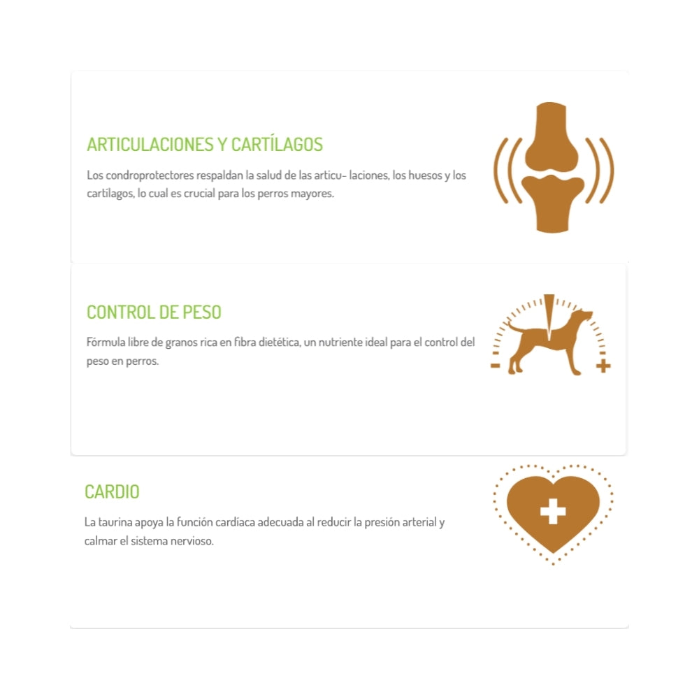 Recomendado para perros mayores de todas las razas (desde 7 años) o con tendencia a aumentar de peso. Adecuado para perros con sensibilidad digestiva, problemas articulares o que necesitan una dieta ligera y funcional.
