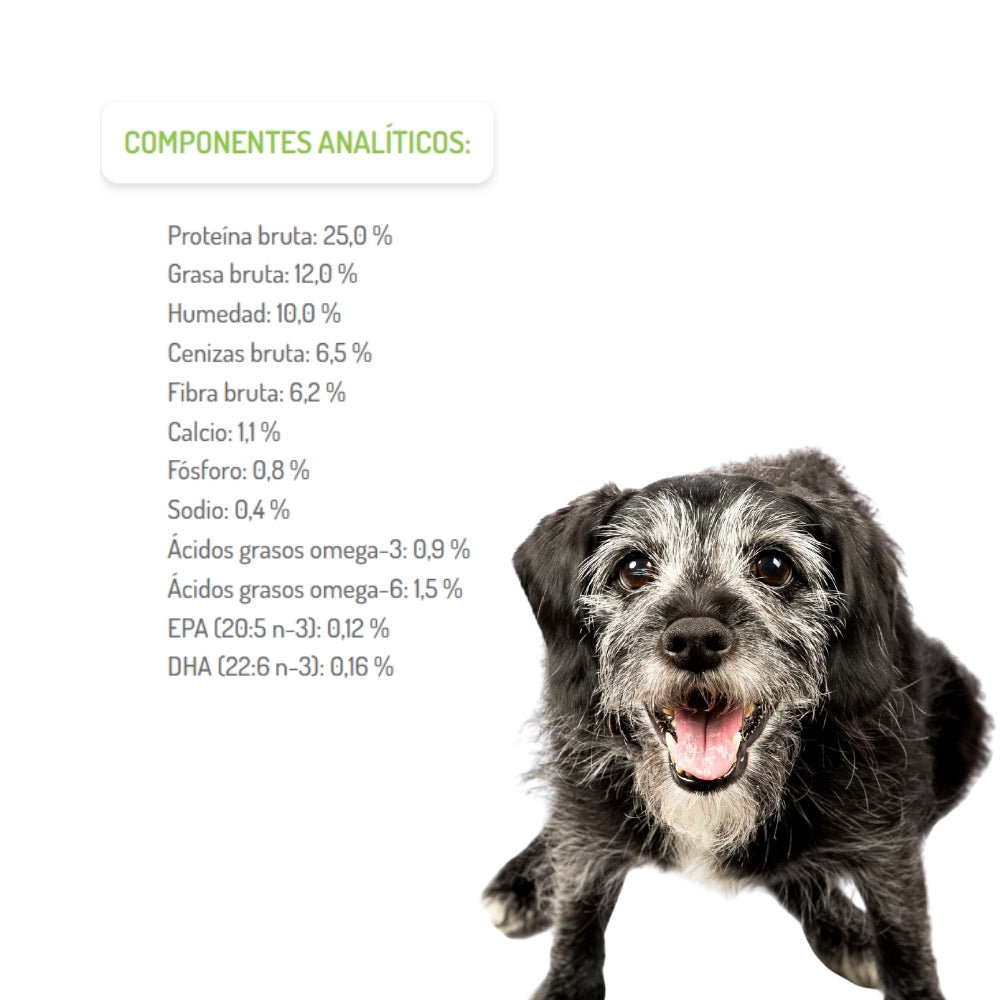 Composición analítica: proteínas 25 %, grasa 12 %, fibra 6,2 %, calcio 1,1 %, fósforo 0,8 %, omega‑3 0,9 %, omega‑6 1,5 %; energía metabólica ~3 410 kcal/kg