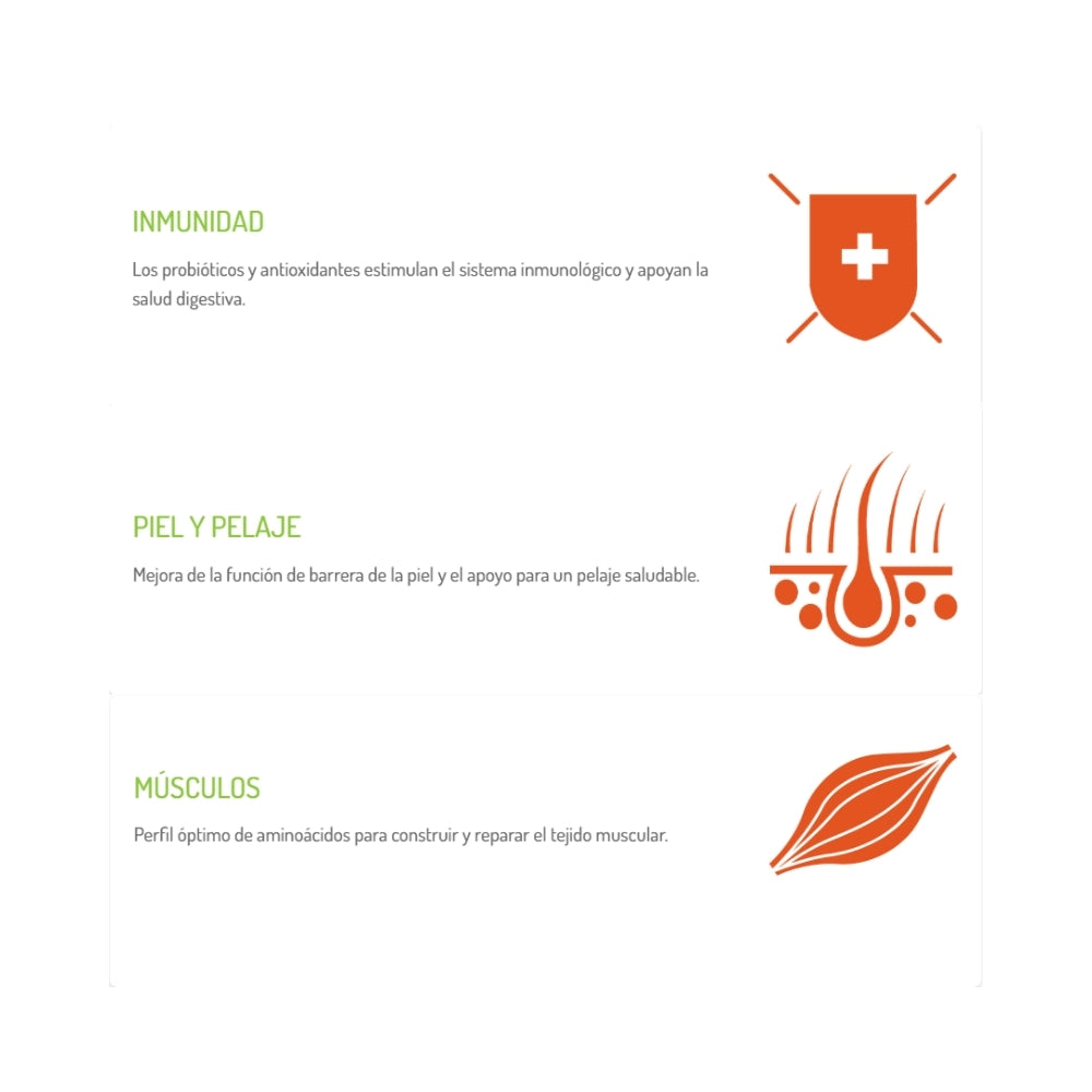 - Omega‑3 y omega‑6: fortalecen piel, pelaje y salud cardiovascular.