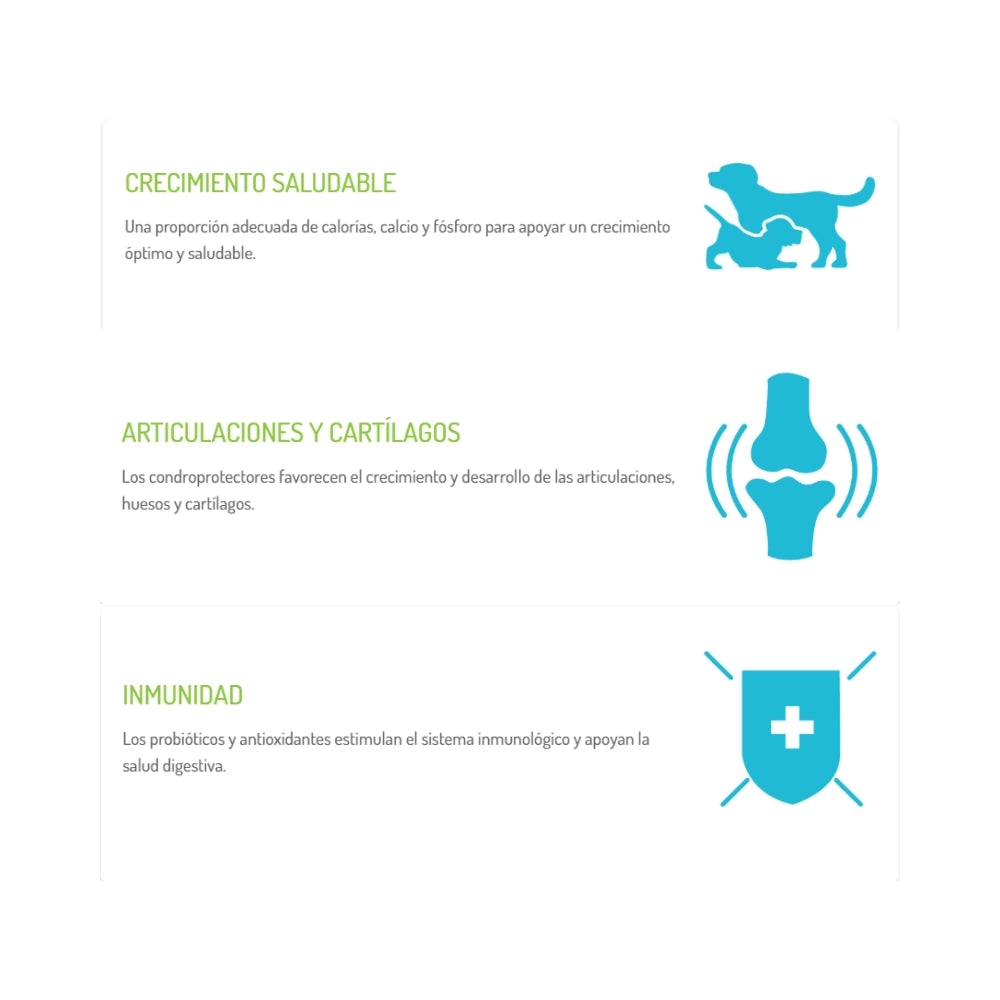 Formulado con cordero (46 %) como única fuente de proteína animal y arroz (30 %) como carbohidrato digestible, esta fórmula minimiza el riesgo de reacciones alérgicas. Enriquecido con aceite de salmón (3 %), prebióticos (MOS/FOS), probióticos inactivos, glucosamina (300 mg/kg) y condroitina (230 mg/kg), además de extractos funcionales como cardo mariano, yuca, β‑glucanos y espino amarillo. Aporta el equilibrio adecuado de calcio y fósforo para un desarrollo óseo saludable, favorece la microbiota intestinal y refuerza el sistema inmunológico, siendo ideal para la etapa de crecimiento.