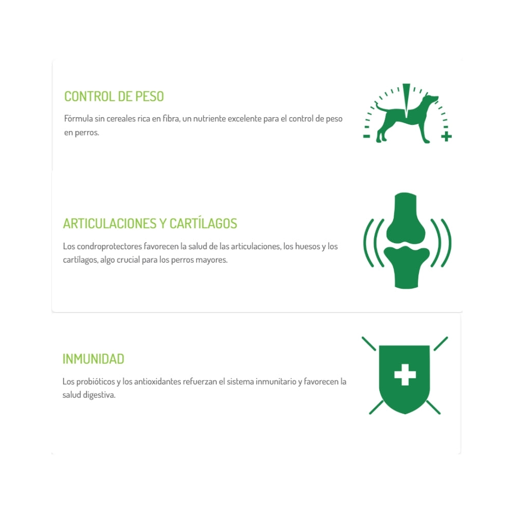 Ideal para perros mayores de cualquier raza, especialmente aquellos con digestión delicada, piel sensible, exceso de peso o predisposición a sobrecarga articular.
