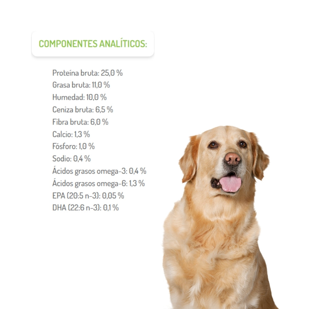 - Buen equilibrio de grasas y energía moderada (~3 380 kcal/kg): adecuado para perros mayores con actividad reducida