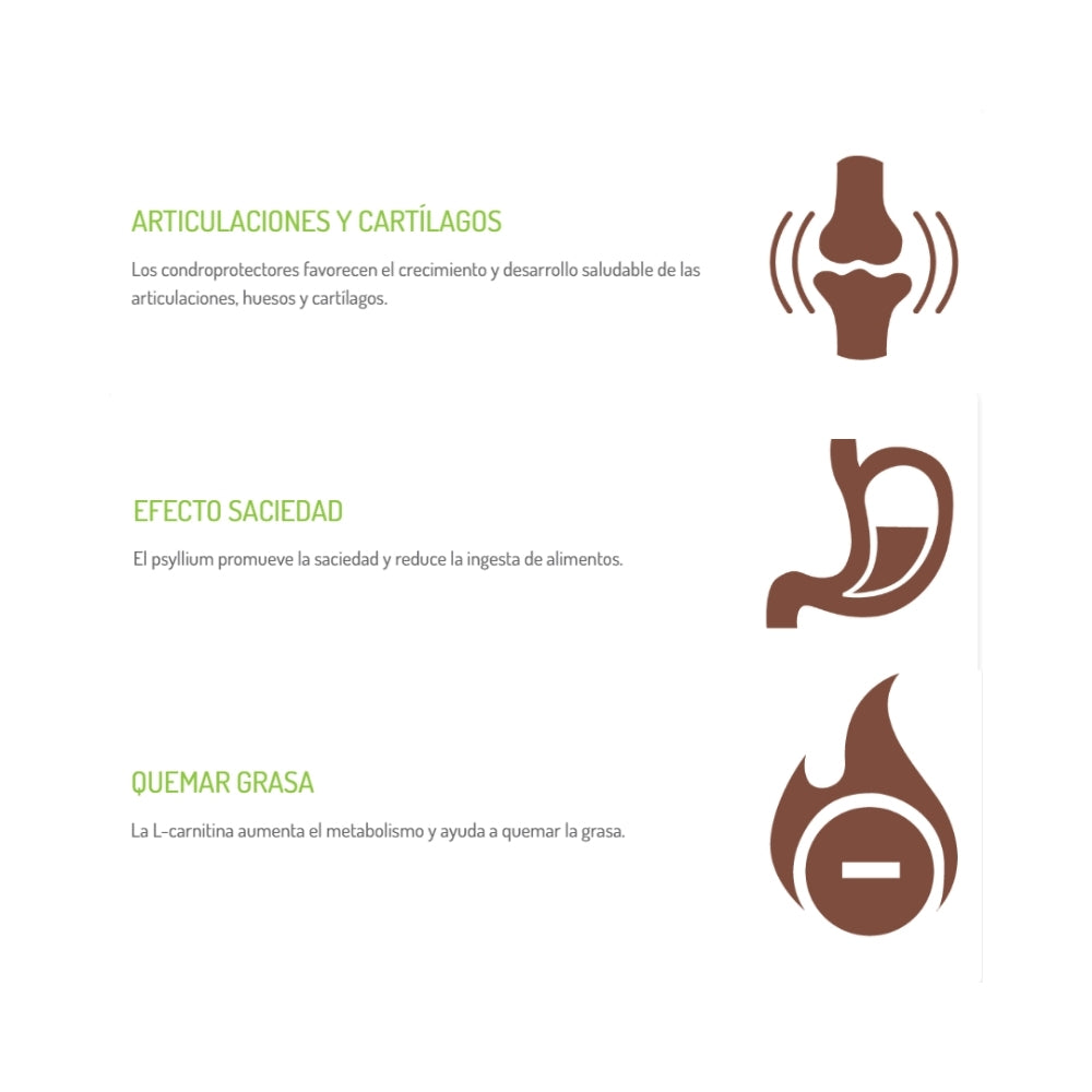 - Pérdida de peso saludable: bajo en grasa, alto en proteína, con L‑carnitina y fibra saciante (psyllium).