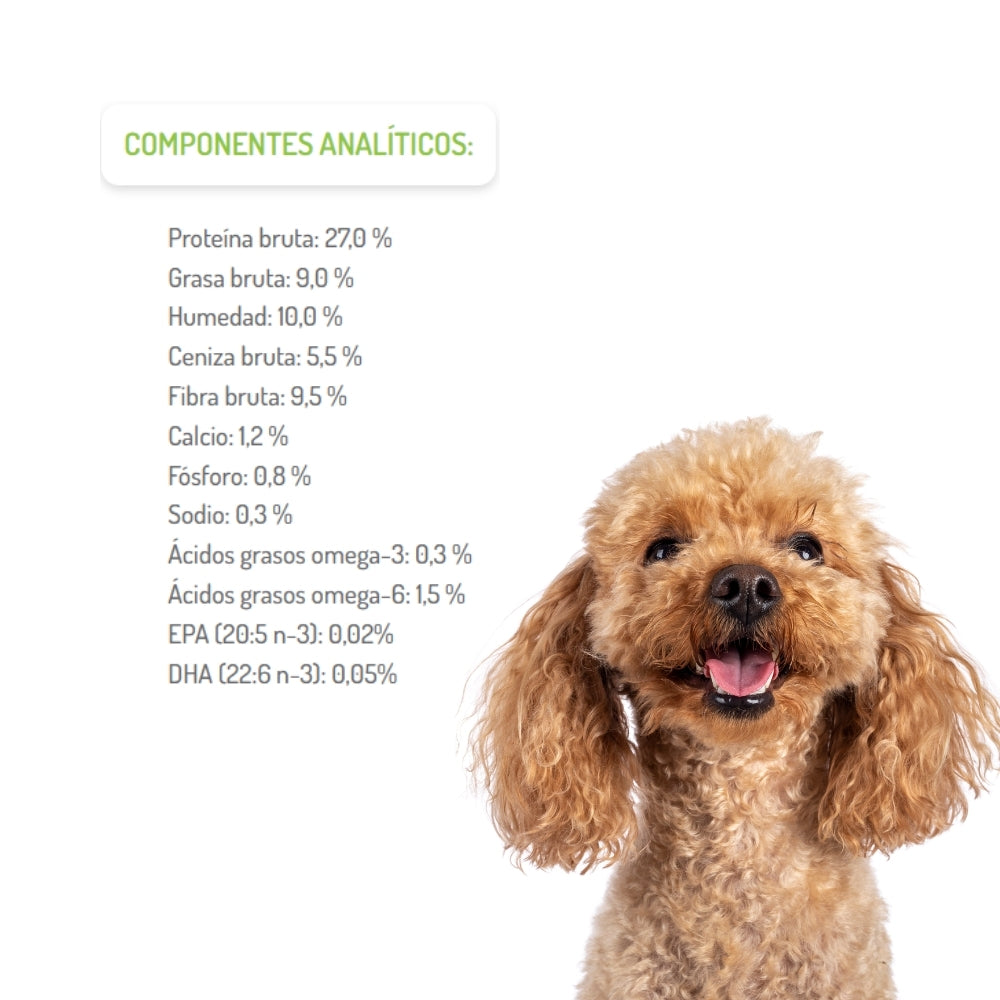 Diseñado para perros adultos de cualquier raza con sobrepeso, esta fórmula monoproteica a base de conejo (36 %) y arroz (35 %) combina sabor delicado y alta digestibilidad. Su perfil bajo en grasa (9 %) y alto en proteína bruta (27 %) promueve la pérdida gradual y saludable de peso. Incluye L‑carnitina para acelerar el metabolismo de las grasas y psyllium para proporcionar saciedad prolongada. Enriquecido con probióticos, cardo mariano (soporte hepático), glucosamina (300 mg/kg), condroitina (230 mg/kg) y fibra (9,5 %), esta fórmula también favorece articulaciones, digestión e inmunidad.