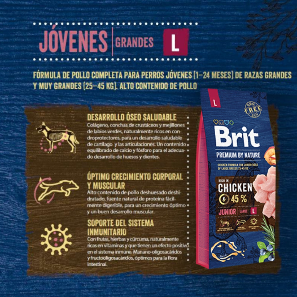 Alimento completo y equilibrado para cachorros de razas grandes. Contiene 45 % de pollo, avena, colágeno, glucosamina, condroitina y aceite de salmón. Favorece el desarrollo óseo, la salud articular, la digestión y la inmunidad.