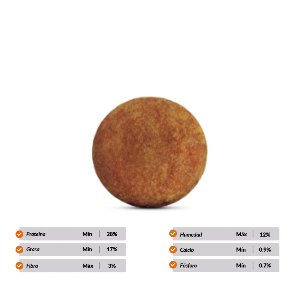 Proteína bruta (min): 28 % - Grasa bruta (min): 17 %