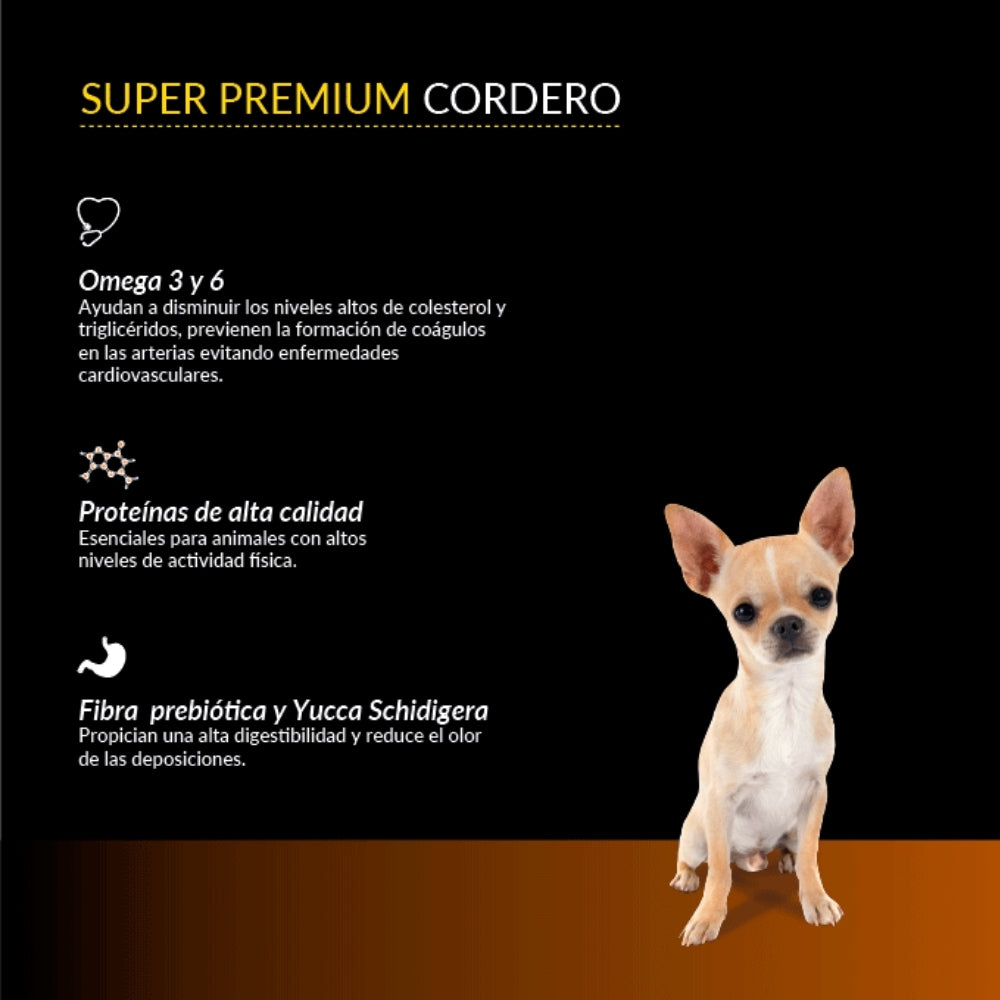 Este alimento premium, 100 % completo y balanceado según estándares AFFCO, está elaborado específicamente para perros adultos de razas pequeñas (tamaño de croqueta adaptado). Su fórmula con harina de cordero y componentes funcionales asegura alto nivel energético y nutricional, favoreciendo digestión, piel, pelaje, higiene dental e inmunidad.