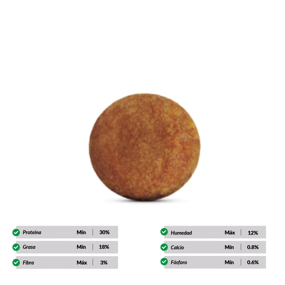 Proteína bruta (min): 28 % - Grasa bruta (min): 17 %