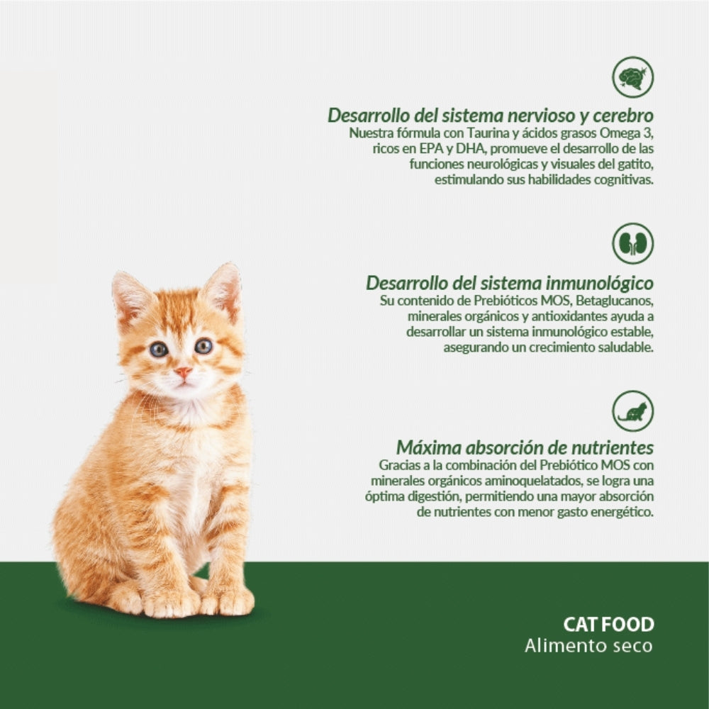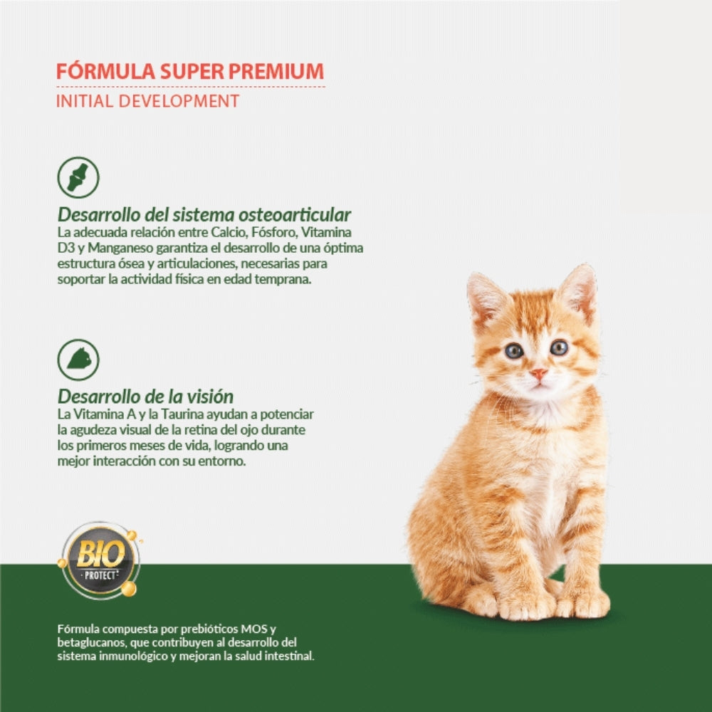 Pienso completo 100 % balanceado con fórmula BioProtect® (prebióticos MOS, betaglucanos, DHA/EPA, vitaminas y minerales orgánicos). Favorece desarrollo inmunológico, digestión, cognición, visión y crecimiento óseo en gatitos hasta los 12 meses.