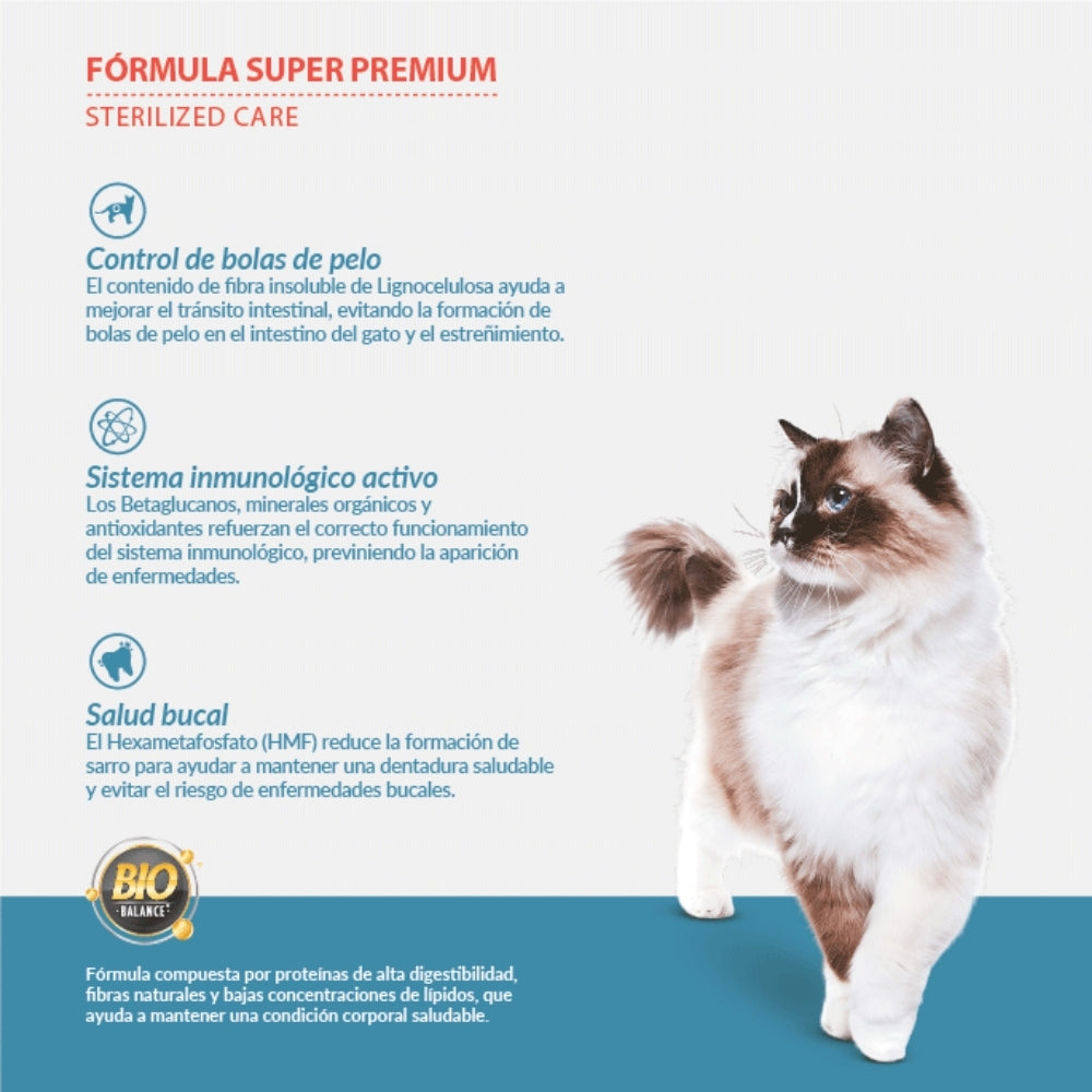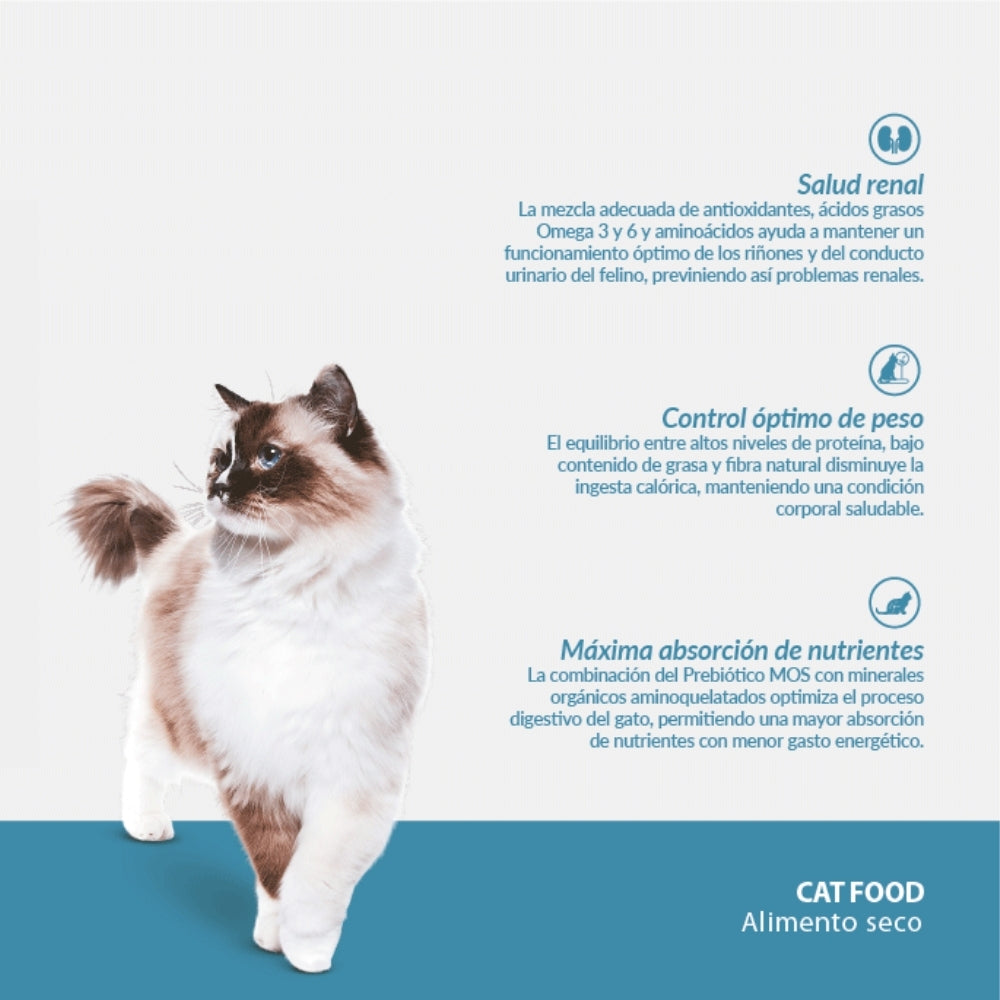 Alimento completo 100 % balanceado con fórmula Bio Balance®: alta proteína (40 %), baja grasa (9 %), fibras funcionales y prebióticos MOS, enriquecido con betaglucanos, hexametafosfato, omega 3‑6 y minerales orgánicos. Controla el peso, protege la salud renal, previene sarro y bolas de pelo.