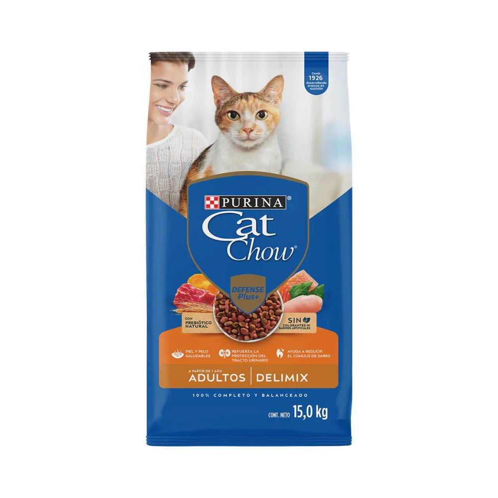 Cat Chow Adultos Delimix 15 kg es un alimento seco completo y balanceado para gatos adultos, con proteínas de alta calidad y vegetales que favorecen su salud y vitalidad diaria.