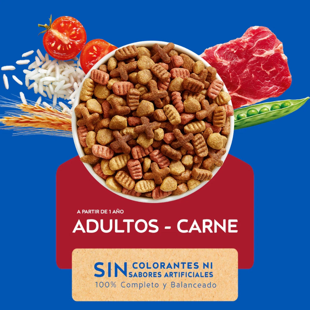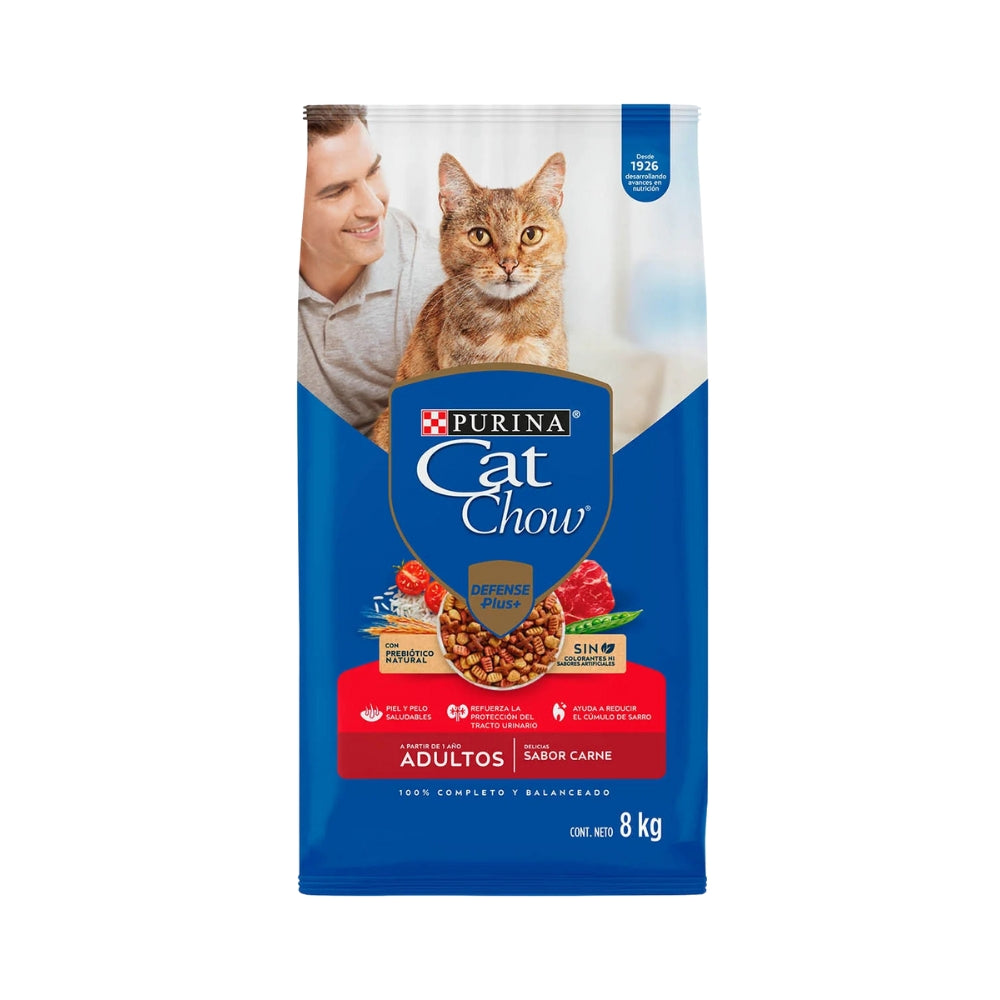 Alimento seco completo para gatos adultos con delicioso sabor a carne, ideal para mantener su salud digestiva, muscular y defensas naturales.
