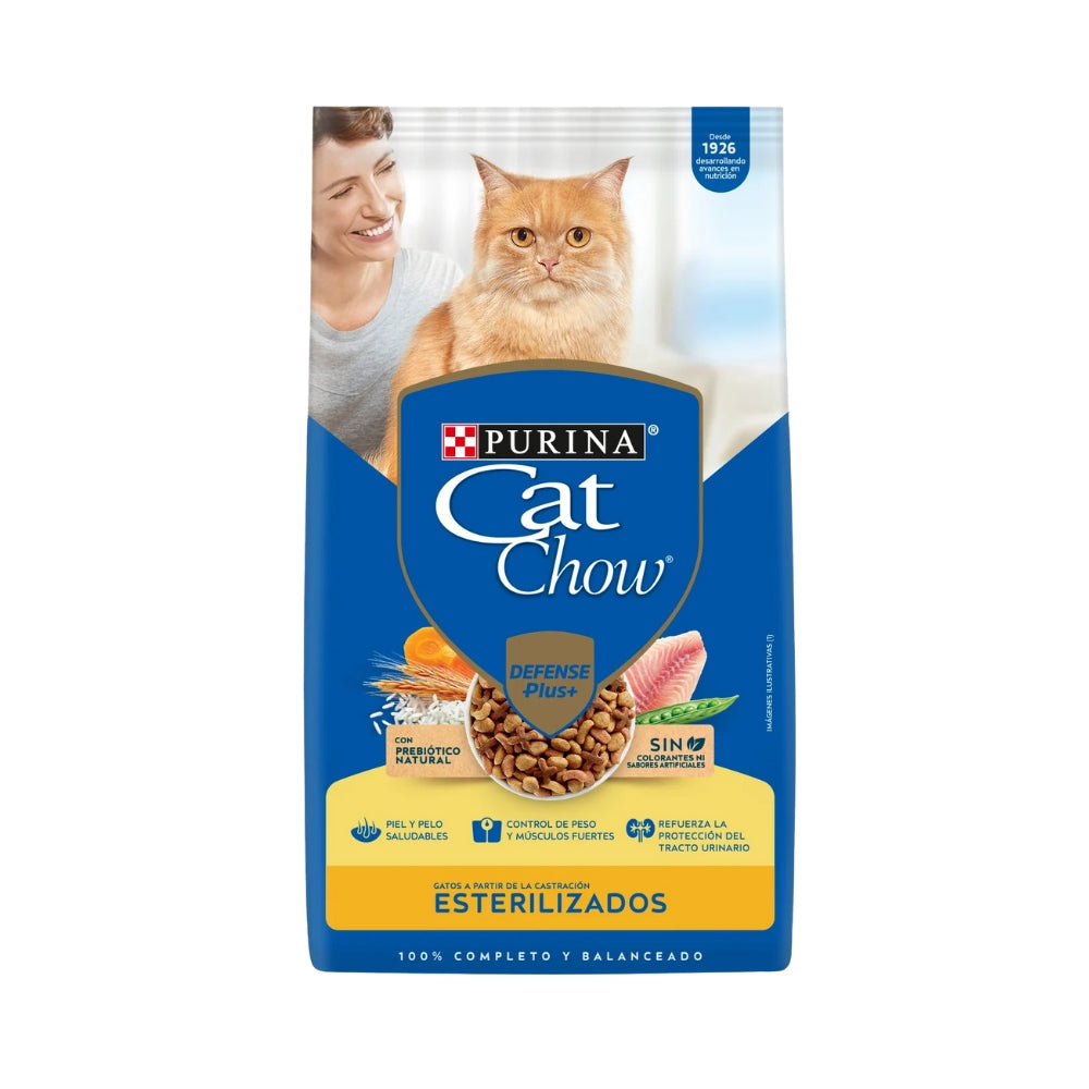 Cat Chow Esterilizados es un alimento seco desarrollado para cubrir las necesidades específicas de los gatos adultos que han sido esterilizados. Su fórmula contiene niveles controlados de grasa y calorías para ayudar a mantener un peso saludable, junto con minerales equilibrados que contribuyen al buen funcionamiento del tracto urinario. Además, está enriquecido con prebiótico natural, proteínas de alta calidad y antioxidantes, lo que favorece una digestión saludable, refuerza el sistema inmunológico y mantiene el bienestar general del gato.