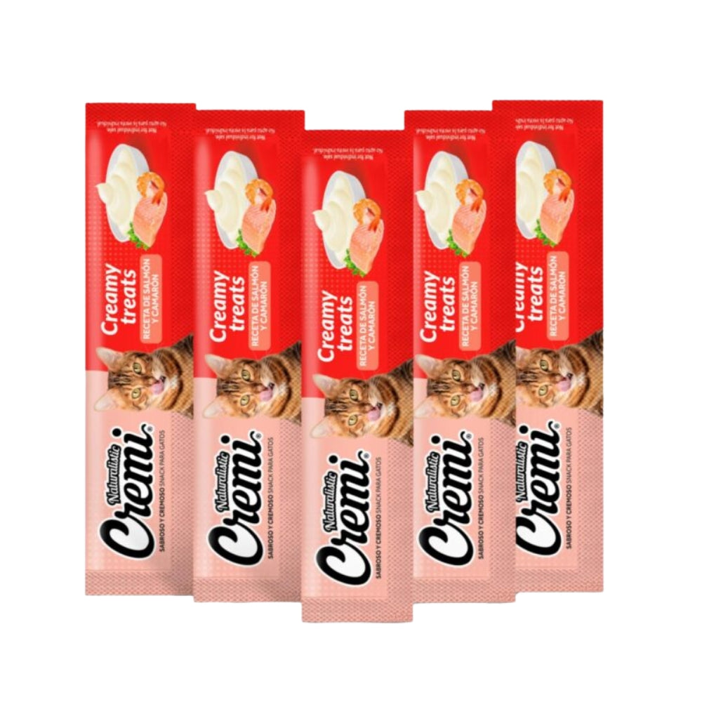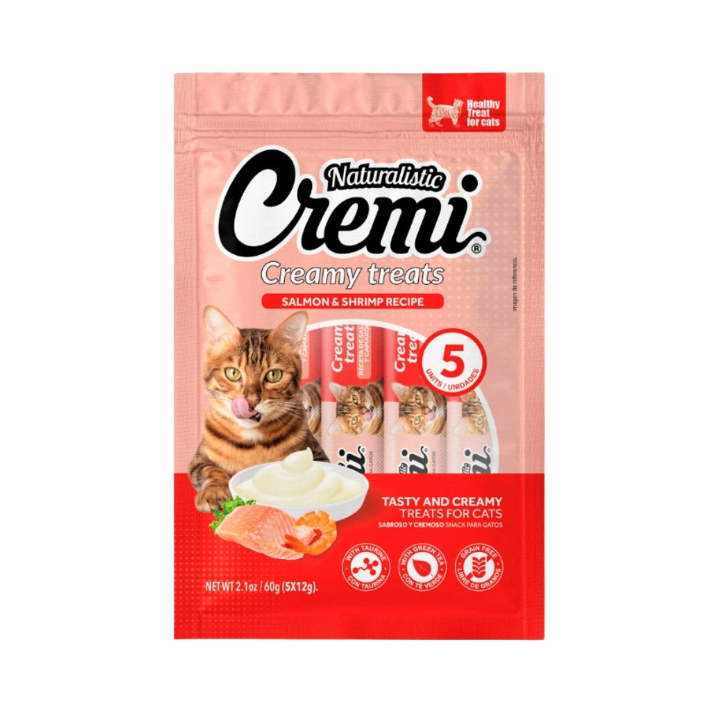 Cremi Salmón y Camarón es un snack cremoso diseñado para gatos adultos y gatitos, elaborado con el delicioso sabor del salmón combinado con camarón y una textura suave que facilita su consumo. Su fórmula está pensada para usarse como premio entre comidas, como complemento sobre el alimento seco o para incentivar la alimentación en gatos selectivos. Cada paquete contiene 5 sobres individuales que aseguran frescura y fácil dosificación. Es una forma práctica y sabrosa de consentir a tu gato mientras aporta hidratación y nutrientes adicionales.