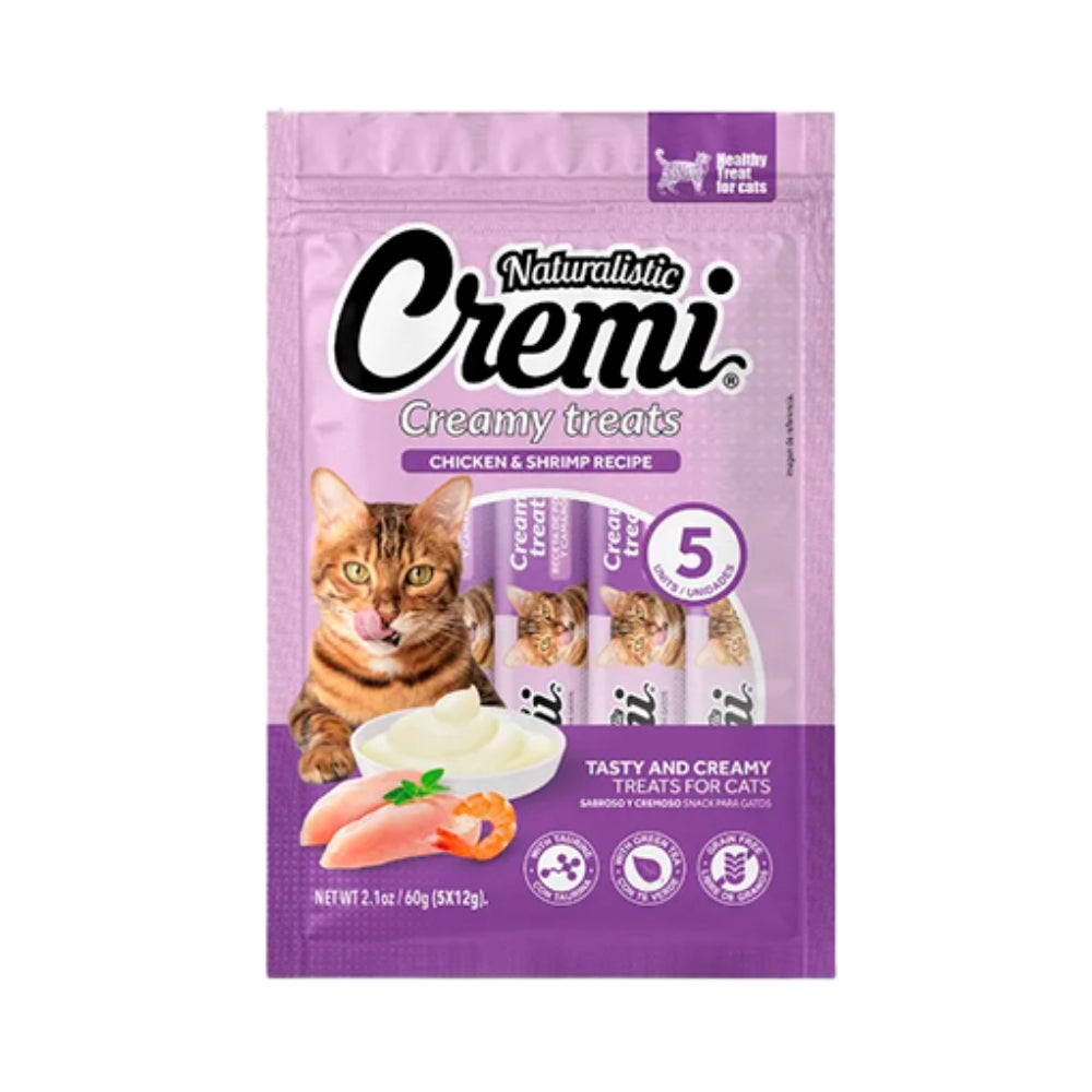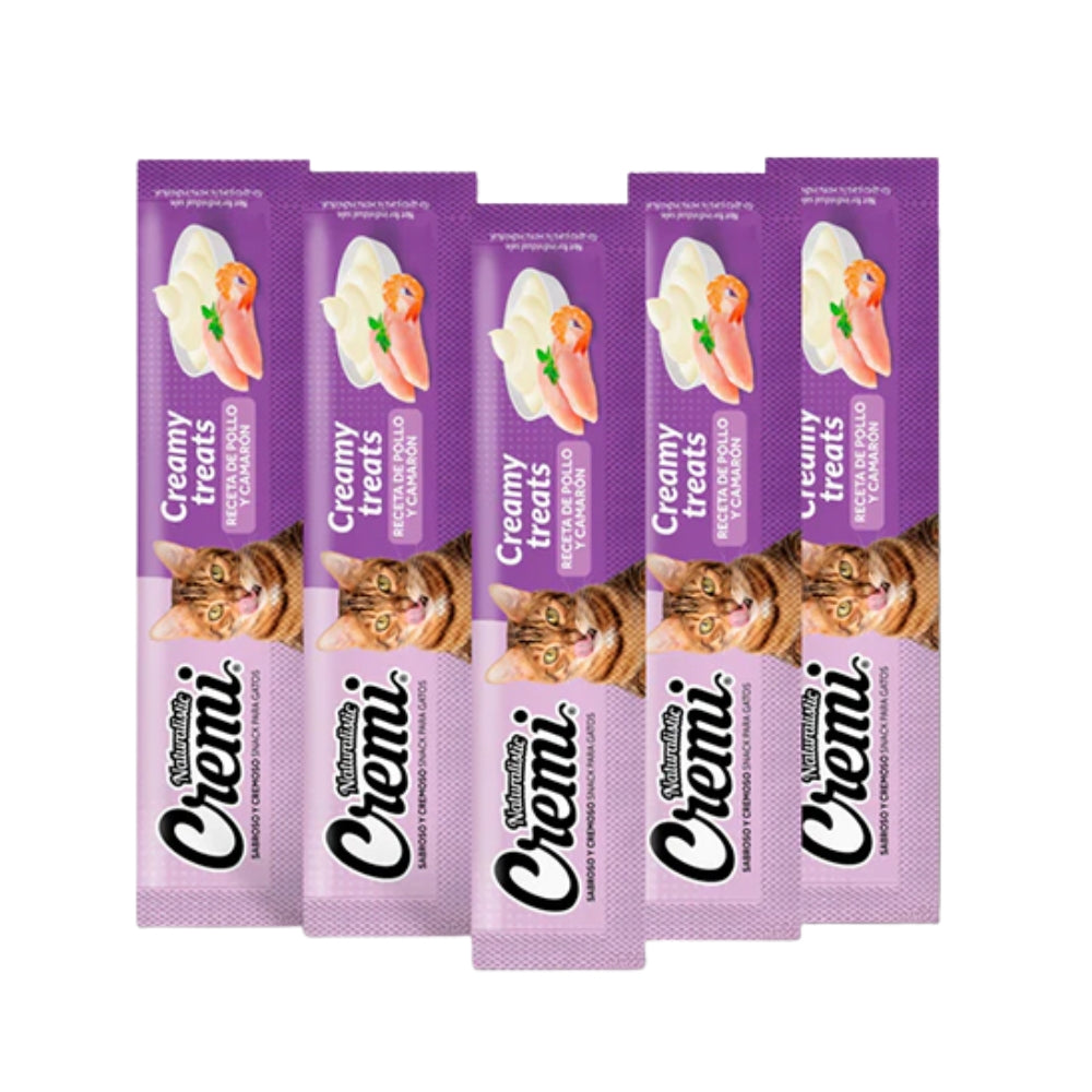Cremi Pollo y Camarón es un snack cremoso diseñado para gatos adultos y gatitos, elaborado con el delicioso sabor del pollo combinado con camarón y una textura suave que facilita su consumo. Su fórmula está pensada para usarse como premio entre comidas, como complemento sobre el alimento seco o para incentivar la alimentación en gatos selectivos. Cada paquete contiene 5 sobres individuales que aseguran frescura y fácil dosificación. Es una forma práctica y sabrosa de consentir a tu gato mientras aporta hidratación y nutrientes adicionales.