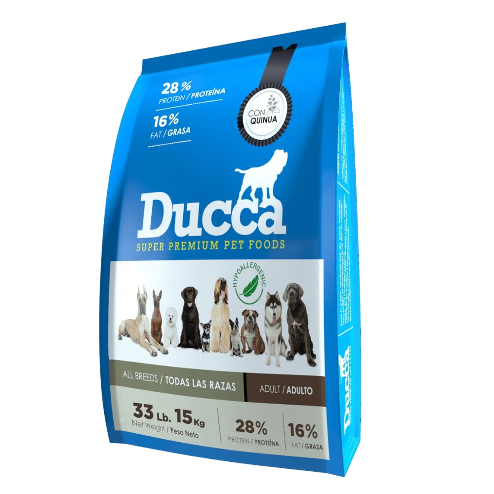 Ducca Adulto Todas las Razas es un alimento seco formulado para perros adultos de cualquier tamaño o raza. Su fórmula proporciona una nutrición balanceada, con proteínas de origen animal que ayudan a mantener la masa muscular, carbohidratos para una energía sostenida y grasas que favorecen una piel sana y pelaje brillante. Enriquecido con vitaminas y minerales esenciales, este alimento es ideal para perros con actividad física moderada, ayudando a mantener su salud general y vitalidad diaria.