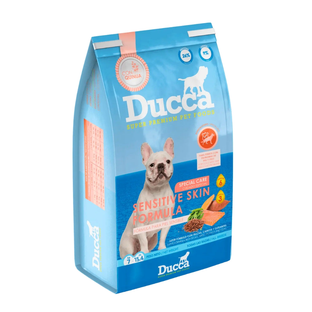 Ducca Sensitive Skin Todas las Razas es un alimento seco desarrollado especialmente para perros adultos que presentan sensibilidad en la piel o pelaje opaco. Su fórmula contiene ingredientes seleccionados para minimizar reacciones adversas, junto con ácidos grasos esenciales Omega 3 y Omega 6 que promueven una piel sana y un pelaje brillante. Enriquecido con vitaminas, minerales y proteínas de calidad, este alimento ayuda a fortalecer el sistema inmunológico, mejorar la digestión y brindar una nutrición completa para perros de cualquier raza.