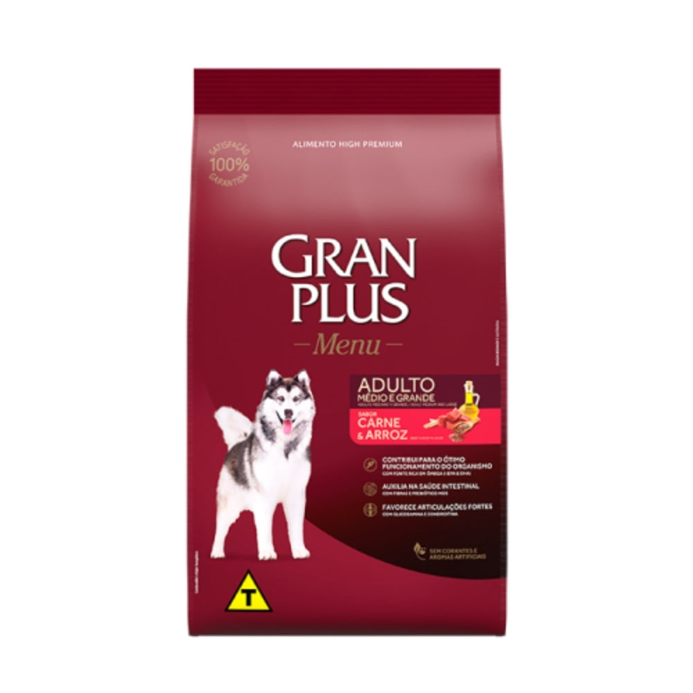 Gran Plus Adulto Razas Medianas y Grandes sabor Carne & Arroz es un alimento seco premium formulado para cubrir las necesidades nutricionales de perros adultos desde los 12 meses. Su fórmula contiene proteínas de alta calidad provenientes de la carne, arroz como fuente de energía fácilmente digestible y un equilibrio ideal de fibras, vitaminas y minerales que favorecen la salud digestiva, el sistema inmunológico y una óptima condición corporal. Además, incluye ácidos grasos esenciales para el cuidado de la piel y un pelaje brillante.