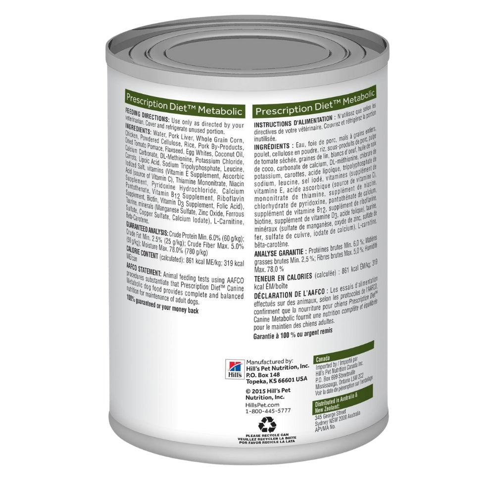 Hill’s Prescription Diet Canine Metabolic en su presentación húmeda está clínicamente formulado para ayudar a los perros a perder peso de manera eficaz y mantener un peso saludable. Con una mezcla especial de nutrientes que activa el metabolismo y ayuda a quemar grasa de forma natural, incluso en reposo. Su textura húmeda y sabor delicioso lo hacen ideal para perros exigentes o para combinar con alimento seco. Recomendado por veterinarios como parte de un tratamiento integral para el control de peso.