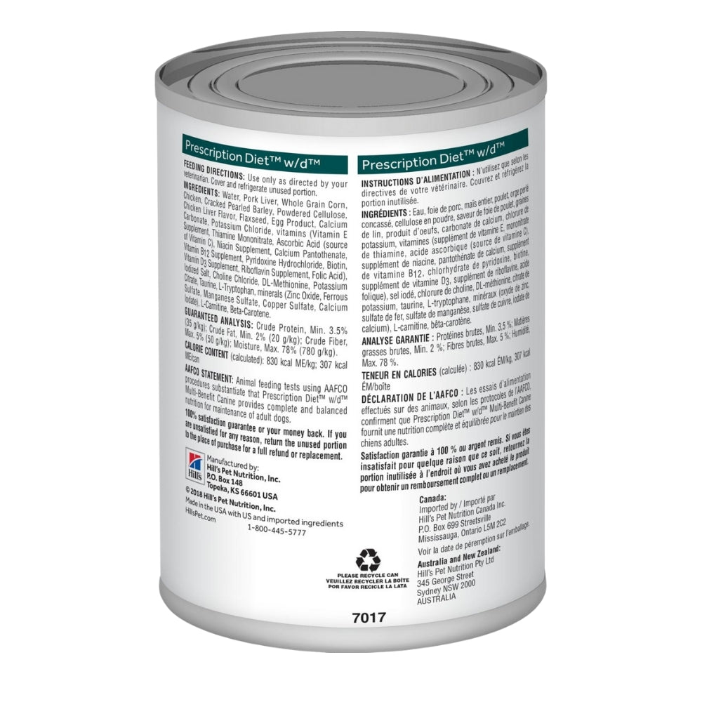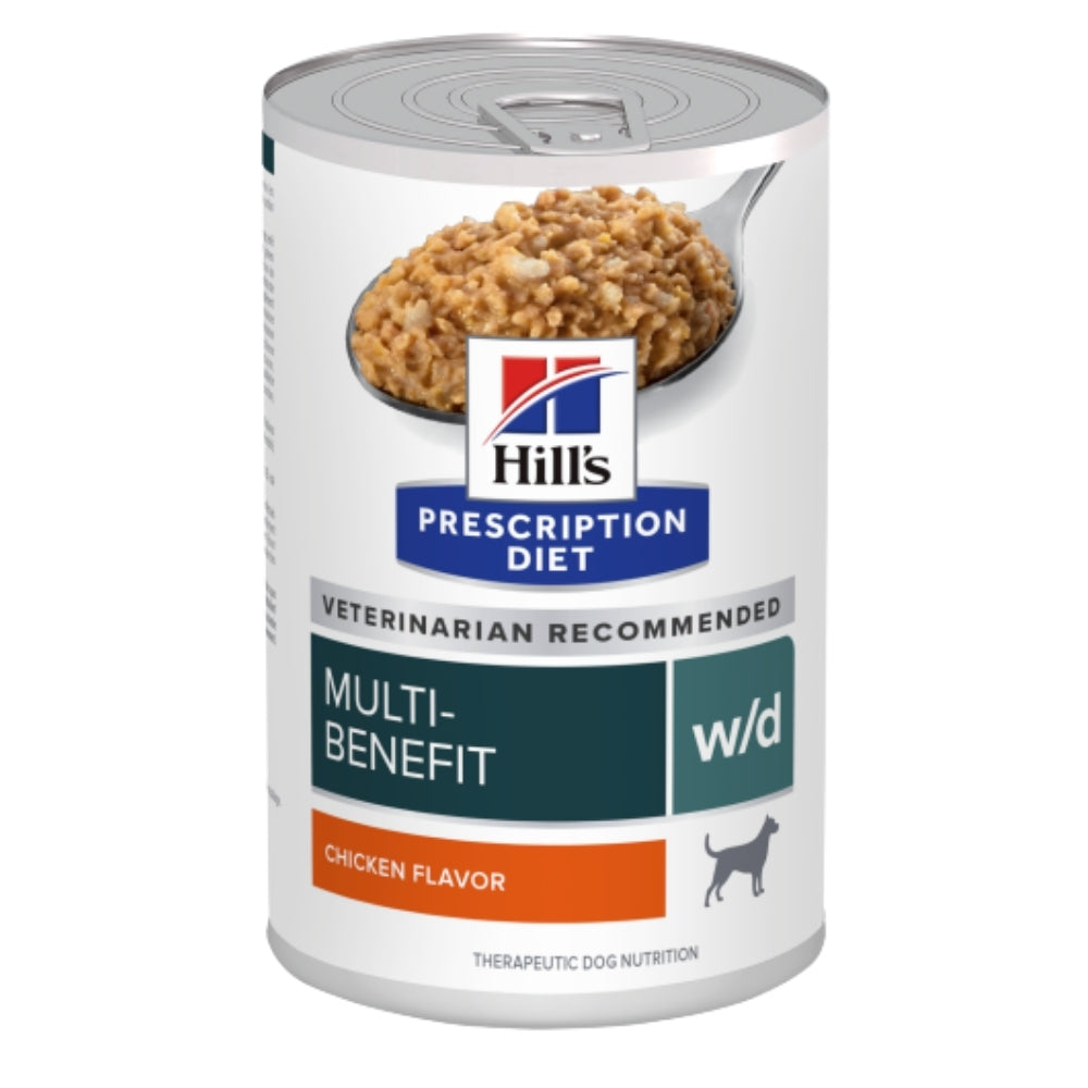 Administrar bajo indicación veterinaria. Ofrecer la cantidad diaria recomendada, dividida en 2 o más comidas. Puede combinarse con la versión seca de Hill’s w/d Multi-Benefit. Refrigerar el contenido no utilizado y mantener agua limpia siempre disponible.