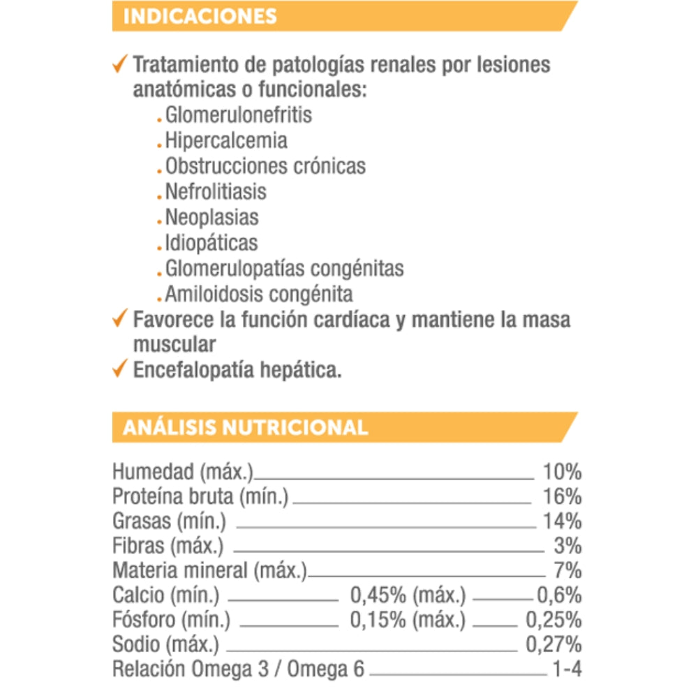 Alimento funcional para perros con enfermedad renal crónica. Bajo en fósforo y proteínas moderadas para proteger la función renal y mejorar su calidad de vida.