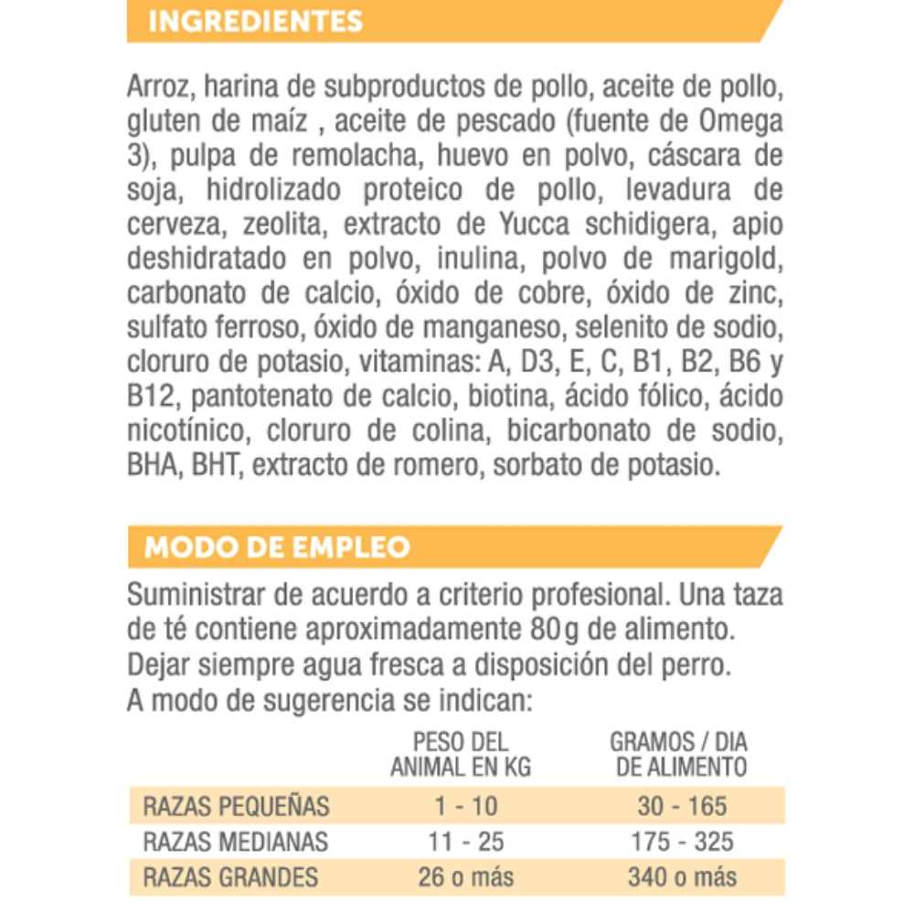 Harina de ave, arroz, grasa de ave, huevo deshidratado, aceite de pescado, pulpa de remolacha, levaduras, minerales quelados, vitaminas, antioxidantes naturales.
