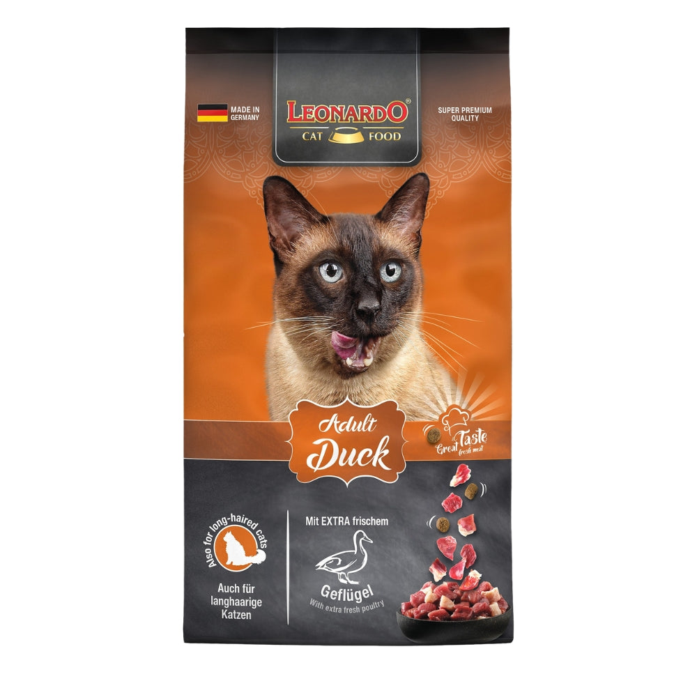Alimento seco super premium con pato como proteína principal. Digestible, nutritivo y sabroso, ideal para gatos adultos exigentes o con digestión sensible, favoreciendo pelaje saludable y bienestar general.