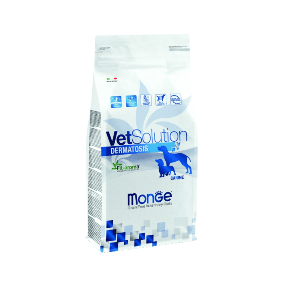 Monge Vet Solution Dermatosis Canine es un alimento dietético completo formulado para el soporte de la función dérmica en caso de dermatosis o pérdida excesiva de pelo. Su fórmula contiene fuentes seleccionadas de proteínas (pescado) y carbohidratos (arroz), reduciendo el riesgo de reacciones adversas alimentarias. Está enriquecido con ácidos grasos Omega 3 y 6, biotina, zinc y nucleótidos que refuerzan la barrera cutánea, disminuyen la inflamación y promueven una piel sana y un pelaje brillante. Ideal para perros con alergias cutáneas, dermatitis atópica o sensibilidad alimentaria relacionada con la piel.