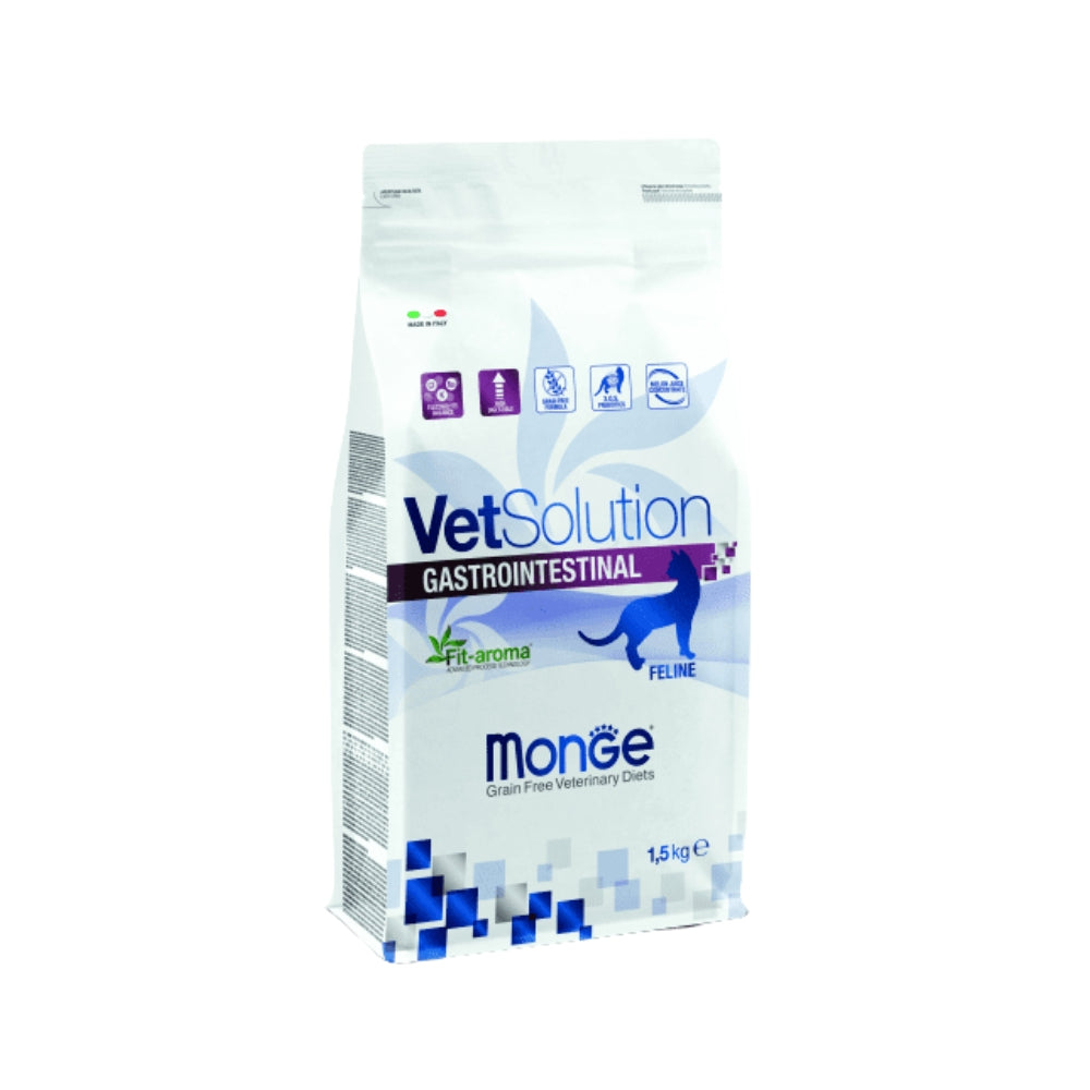 Monge Vet Solution Gastrointestinal Feline es un alimento completo y balanceado, formulado para gatos que padecen trastornos digestivos agudos o crónicos, diarreas o problemas de absorción intestinal. Elaborado con ingredientes de alta digestibilidad como arroz y proteínas seleccionadas de pescado, su fórmula reduce el esfuerzo digestivo y mejora la asimilación de nutrientes. Enriquecido con prebióticos (MOS y FOS), aloe vera y nucleótidos que promueven la regeneración de la mucosa intestinal, equilibran la microbiota y fortalecen el sistema inmune. Ideal como apoyo nutricional durante la recuperación gastrointestinal.