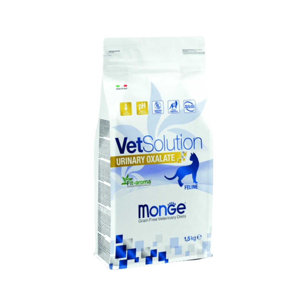 Monge Vet Solution Urinary Oxalate Feline es un alimento completo formulado para gatos que necesitan apoyo nutricional en la prevención de cálculos urinarios por oxalato de calcio. Su contenido mineral controlado, bajo en calcio y fósforo, junto con un pH urinario ligeramente ácido, contribuye a disolver los cristales y prevenir su recurrencia. Enriquecido con ingredientes funcionales como aloe vera, nucleótidos y prebióticos (MOS y FOS) que favorecen la regeneración celular, protegen el sistema urinario y mejoran la salud digestiva e inmunitaria. Su formulación digestible y equilibrada es ideal para el manejo prolongado de trastornos urinarios.