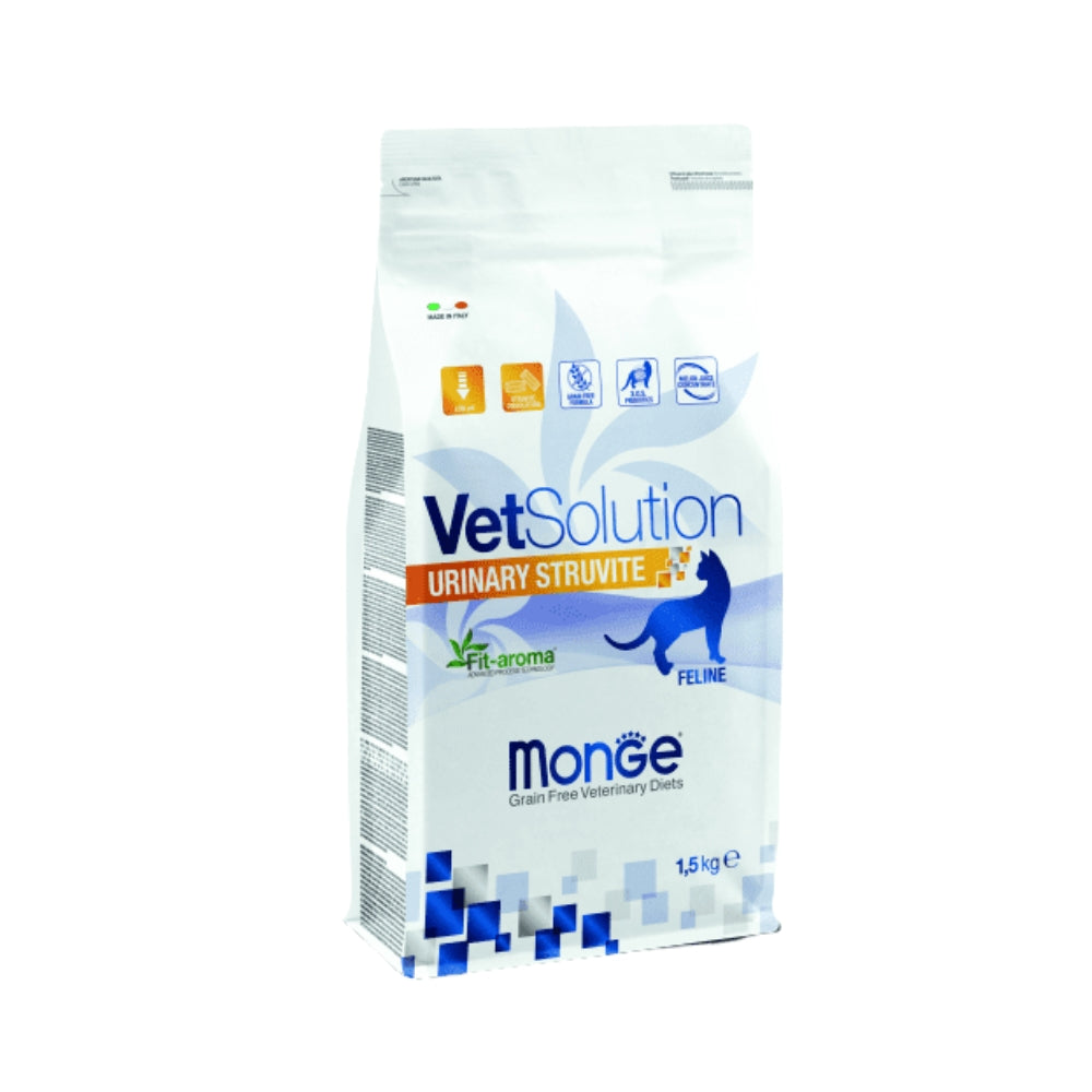 Monge Vet Solution Urinary Struvite Feline es un alimento completo diseñado para el manejo nutricional de gatos con cálculos urinarios de estruvita. Su formulación especializada ayuda a disolver los cristales existentes y prevenir su formación futura, gracias a un contenido reducido de magnesio y fósforo, y a su capacidad de acidificar la orina. Enriquecido con ingredientes funcionales como aloe vera, nucleótidos y prebióticos (MOS y FOS), promueve la regeneración de tejidos, refuerza el sistema inmunológico y mejora la salud digestiva. Es ideal como parte de un tratamiento integral de la enfermedad del tracto urinario inferior felino (FLUTD).