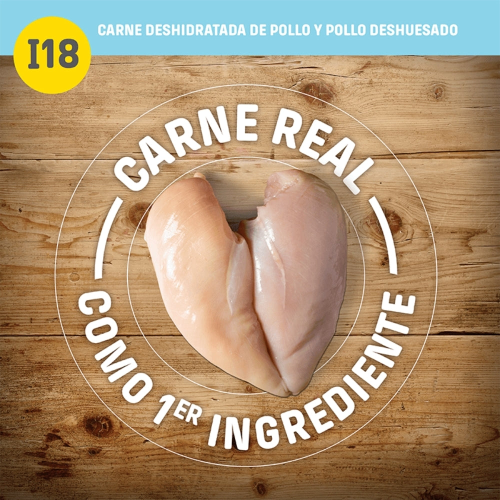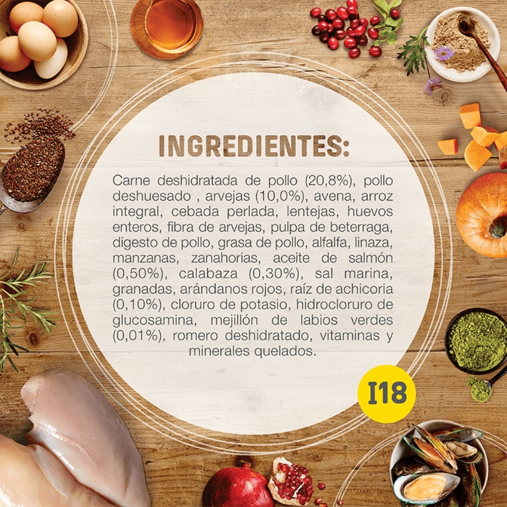 Harina de pollo, pescado blanco deshidratado, avena integral, arroz integral, calabaza deshidratada, semillas de lino, aceite de pescado, levadura de cerveza, arándanos, cúrcuma, extracto de romero, prebióticos (FOS y MOS), vitaminas y minerales quelados.
