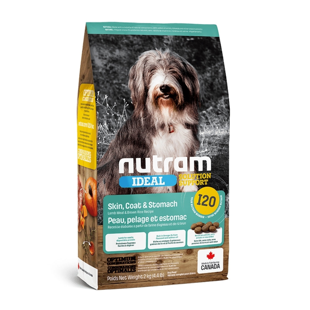 Nutram I20 Skin, Coat & Stomach Dog es un alimento seco completo especialmente formulado para perros adultos con piel sensible, pelaje seco o problemas digestivos. Contiene proteínas de fácil digestión como cordero y pescado blanco, junto con fuentes naturales de omega 3 y 6 que favorecen una piel saludable y un pelaje brillante. La inclusión de calabaza, linaza y avena integral aporta fibras solubles que promueven una digestión suave, mientras que los prebióticos naturales apoyan la flora intestinal. Esta fórmula es libre de trigo, maíz y soya, ideal para perros con sensibilidades alimentarias.