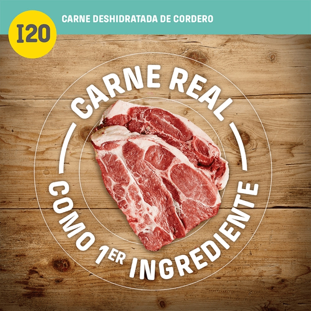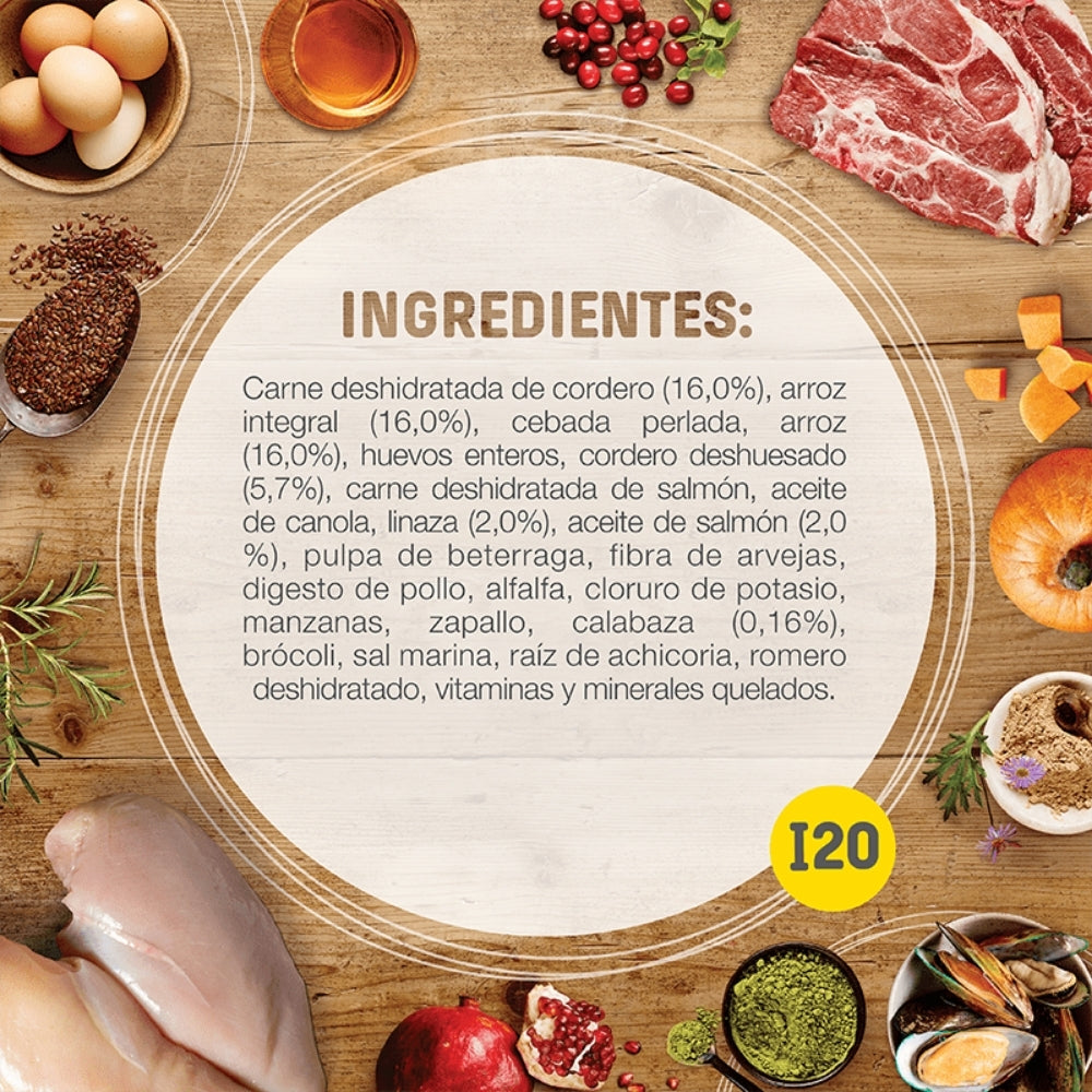 Harina de cordero, pescado blanco deshidratado, arroz integral, avena integral, calabaza deshidratada, semillas de lino, aceite de pescado, levadura de cerveza, prebióticos (FOS y MOS), extracto de romero, arándanos, cúrcuma, vitaminas y minerales quelados.