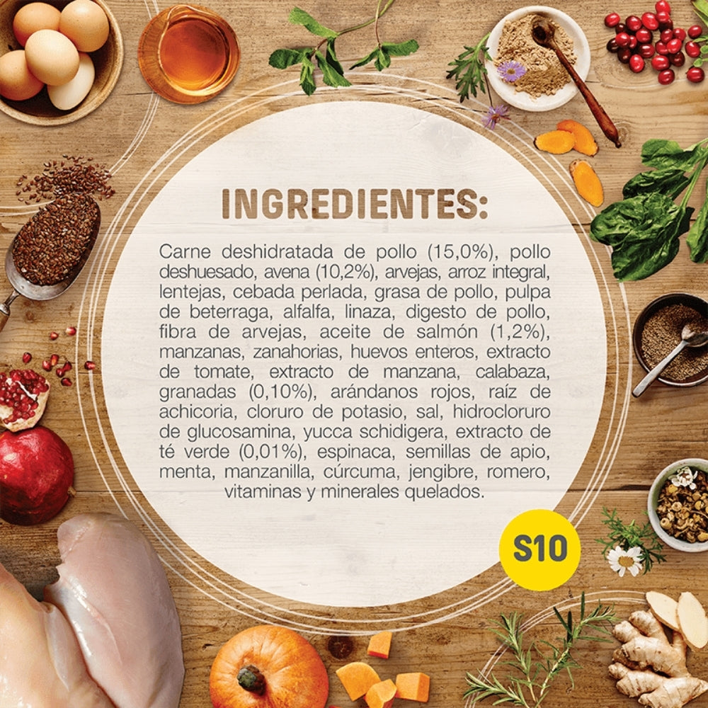 Harina de pollo, pescado blanco deshidratado, arroz integral, avena integral, semillas de lino, calabaza deshidratada, aceite de pescado, cúrcuma, arándanos, levadura de cerveza, extracto de romero, prebióticos (FOS y MOS), vitaminas y minerales quelados.