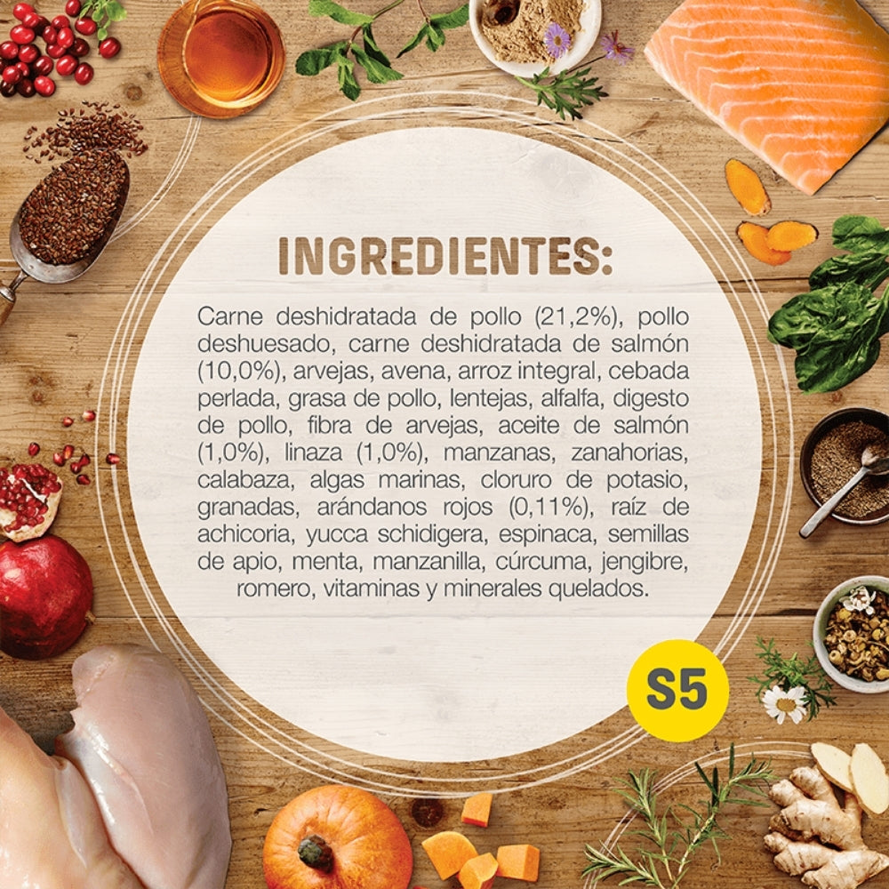 Harina de pollo, salmón deshidratado, arroz integral, avena integral, calabaza deshidratada, semillas de lino, aceite de pescado, arándanos, manzanilla, cúrcuma, levadura de cerveza, extracto de romero, prebióticos (FOS y MOS), vitaminas y minerales quelados.