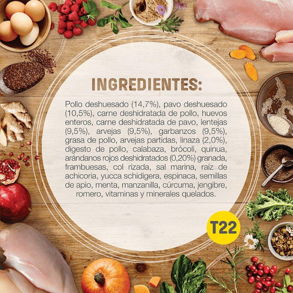 Harina de pollo, pavo deshidratado, arroz integral, avena integral, calabaza deshidratada, semillas de lino, aceite de pescado, arándanos, apio, manzanilla, cúrcuma, levadura de cerveza, extracto de romero, prebióticos (FOS y MOS), vitaminas y minerales quelados.