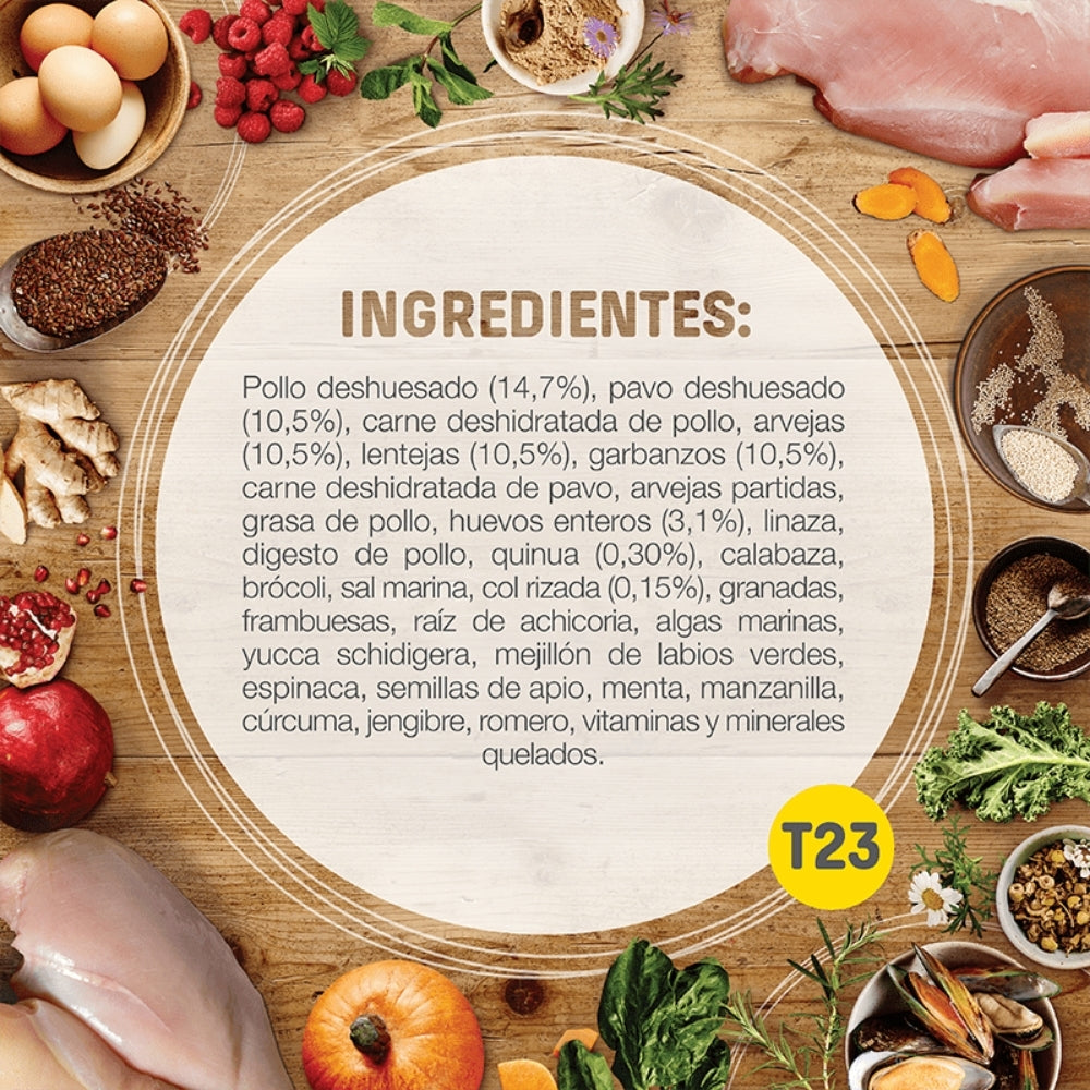 Harina de pollo, pavo deshidratado, arroz integral, avena integral, calabaza deshidratada, aceite de pescado, semillas de lino, arándanos, manzanilla, cúrcuma, levadura de cerveza, extracto de romero, glucosamina, condroitina, prebióticos (FOS y MOS), vitaminas y minerales quelados.