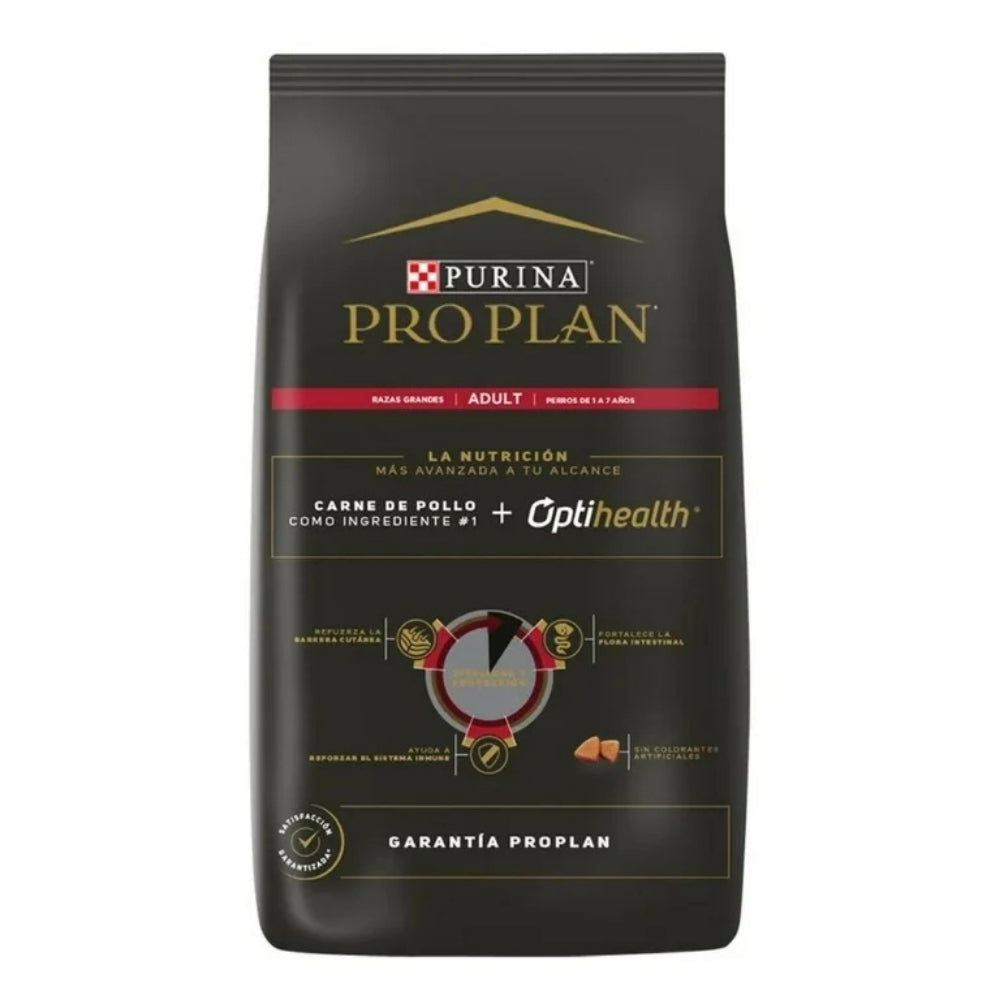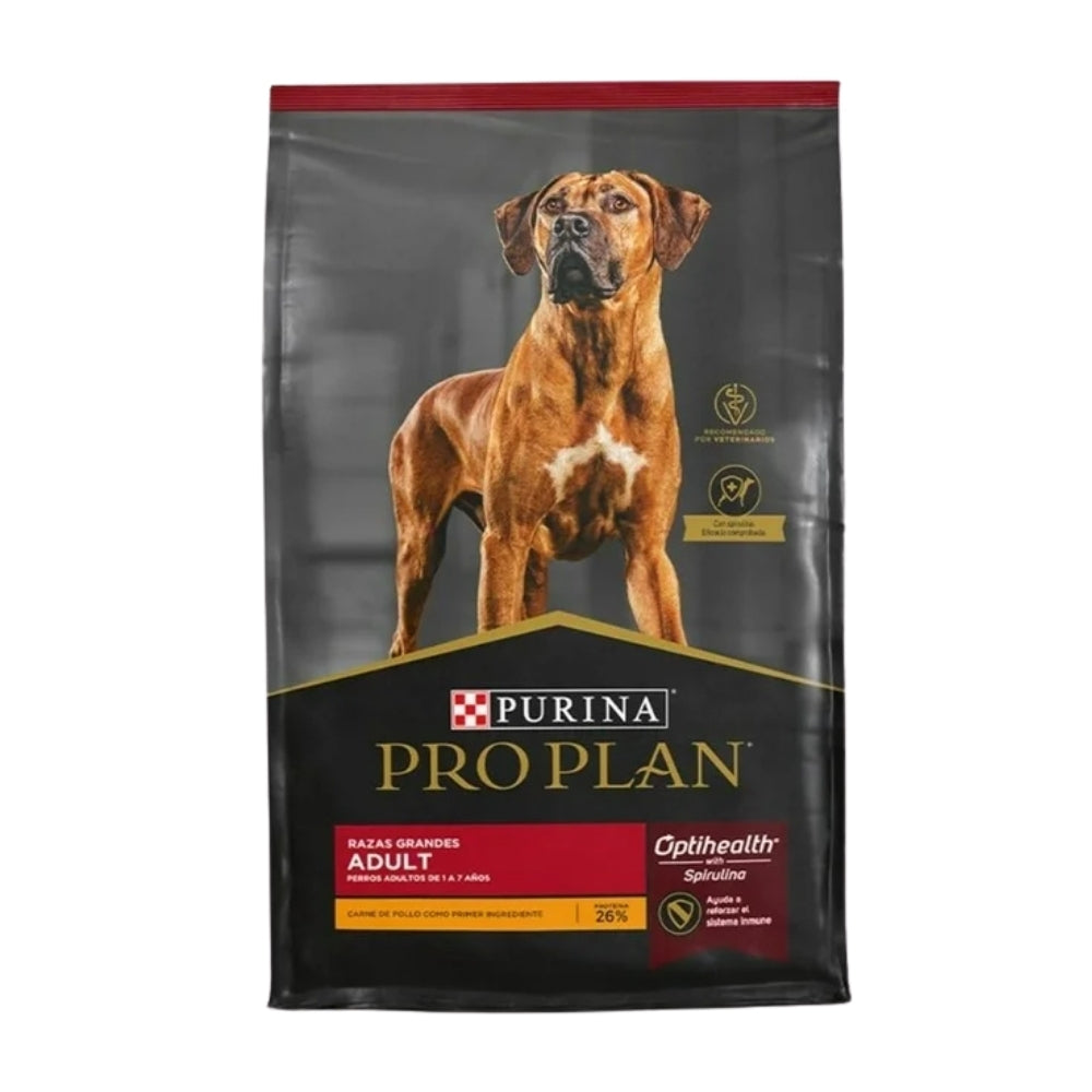 Pro Plan Adult Razas Grandes es un alimento seco de alta calidad formulado especialmente para perros adultos de razas grandes, con un peso corporal superior a 25 kg. Contiene pollo como primer ingrediente, una fuente de proteína animal de alta digestibilidad que contribuye al mantenimiento de una masa muscular óptima. Su fórmula incluye niveles adecuados de glucosamina y EPA, un ácido graso omega 3, que ayudan a proteger y fortalecer las articulaciones, favoreciendo una movilidad saludable. Además, contiene antioxidantes naturales, vitaminas y minerales esenciales que refuerzan el sistema inmunológico y promueven una condición corporal ideal.