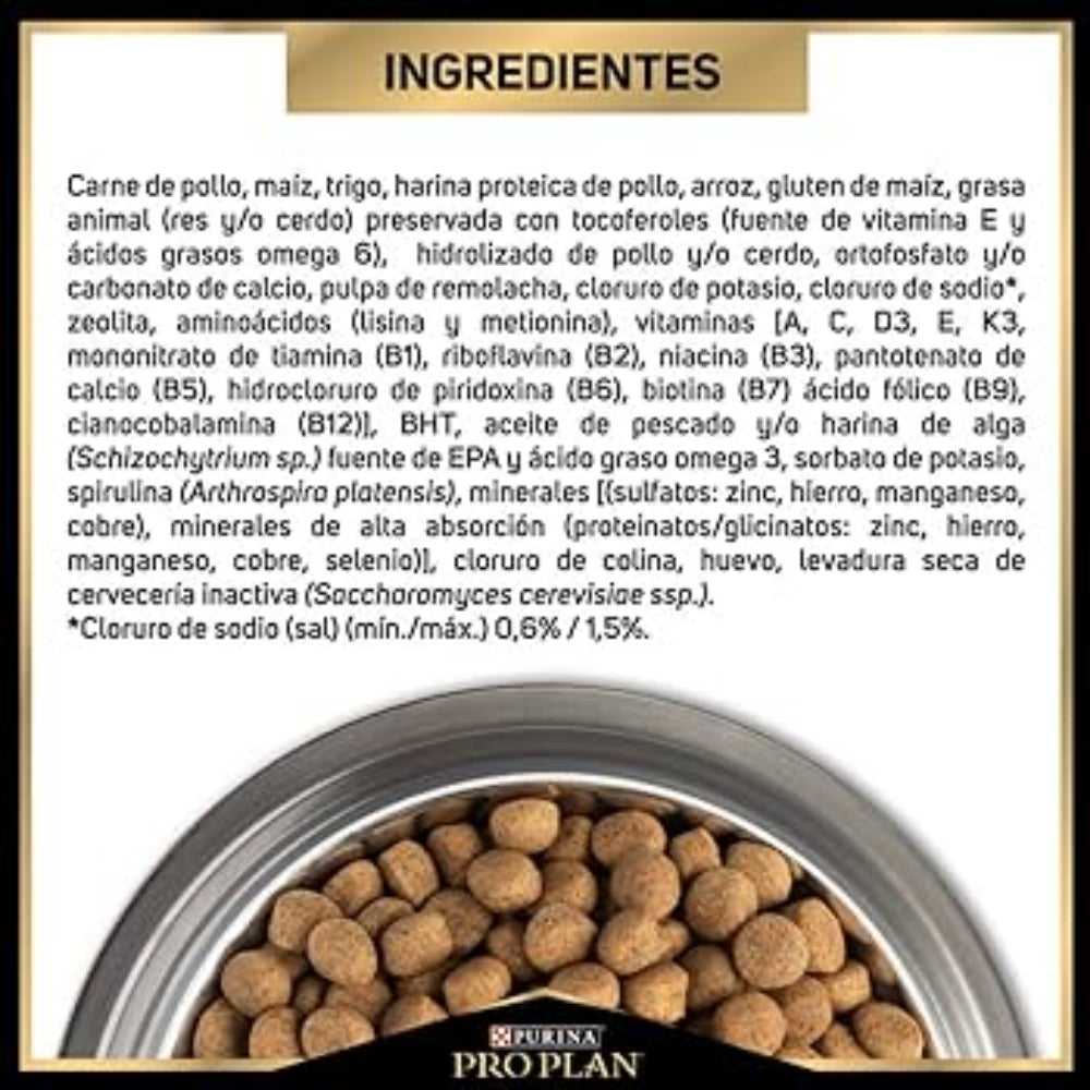 Pollo, arroz, maíz, harina de subproductos de pollo, harina de soya, grasa animal estabilizada con tocoferoles (fuente de vitamina E), pulpa de remolacha, aceite de pescado (fuente de EPA y DHA), cloruro de potasio, minerales quelados, prebióticos, vitaminas (A, C, D, E, complejo B), antioxidantes naturales.