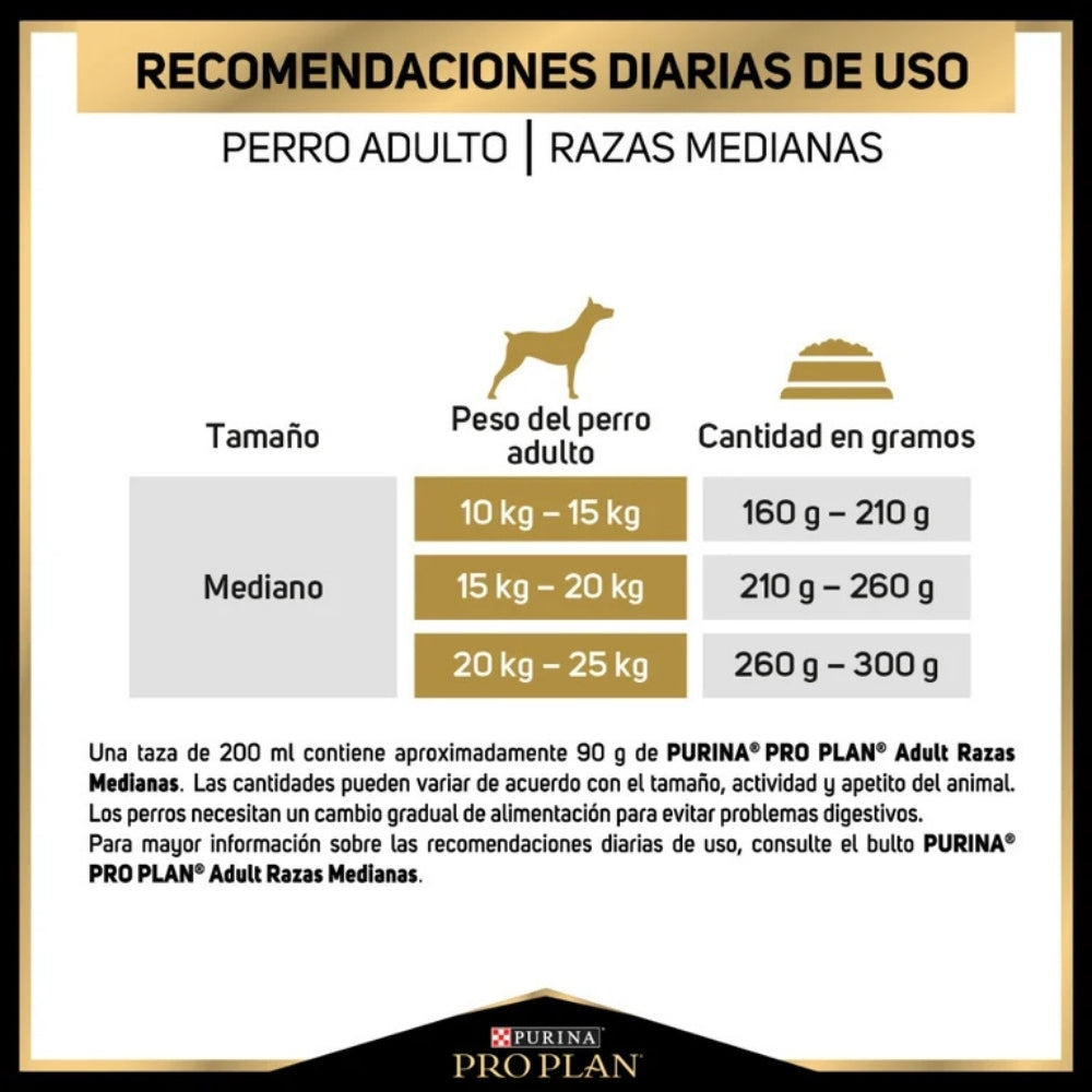 Pro Plan Adult Razas Medianas de Pollo es un alimento seco premium formulado para satisfacer las necesidades nutricionales de perros adultos de razas medianas, entre 10 y 25 kg. Contiene pollo como primer ingrediente, una fuente de proteína de alta calidad que ayuda a mantener una masa muscular magra y saludable. Su fórmula incluye prebióticos naturales que favorecen una digestión eficiente, y antioxidantes como la vitamina C y E que refuerzan el sistema inmunológico. Además, está enriquecido con ácidos grasos omega 3 y 6 que mejoran la salud de la piel y el brillo del pelaje. No contiene colorantes ni saborizantes artificiales.