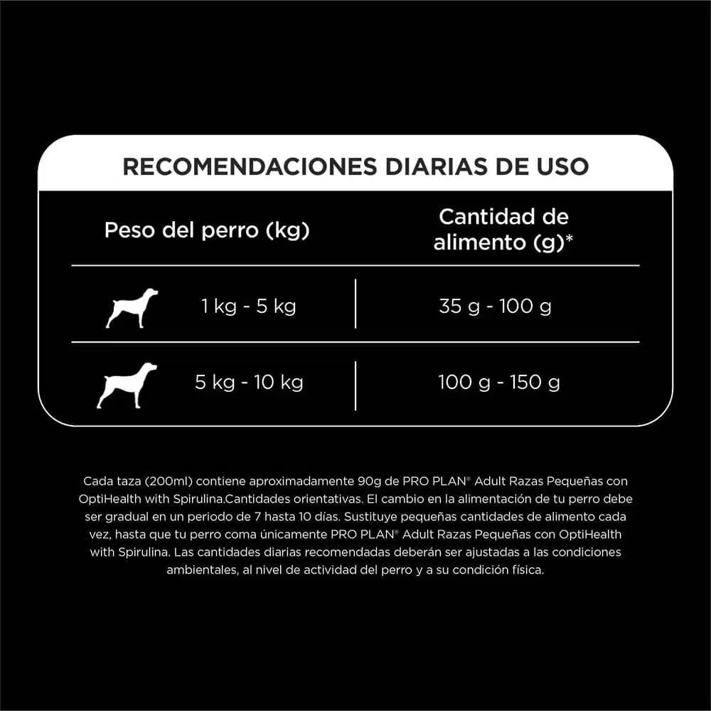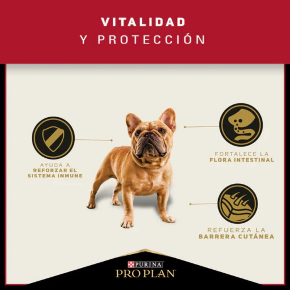 Pro Plan Adult Razas Pequeñas de Pollo es un alimento seco de alta calidad desarrollado específicamente para perros adultos de razas pequeñas, que requieren una nutrición concentrada y adaptada a su metabolismo acelerado. Elaborado con pollo como primer ingrediente, proporciona proteínas de alta digestibilidad para el mantenimiento de una masa muscular óptima. Sus croquetas pequeñas están diseñadas para facilitar la masticación. Contiene prebióticos naturales que promueven una digestión saludable, antioxidantes que fortalecen las defensas naturales, y ácidos grasos omega 3 y 6 que mejoran la salud de la piel y el pelaje. Libre de colorantes y saborizantes artificiales.