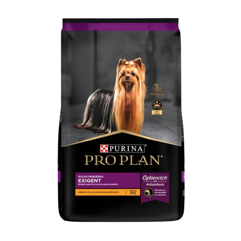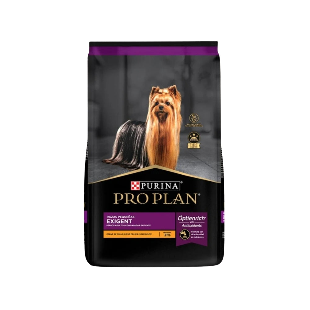 Pro Plan Exigent Adult Razas Pequeñas de Pollo está especialmente formulado para perros adultos de razas pequeñas con paladar exigente. Contiene pollo como fuente principal de proteína animal de alta digestibilidad y gran sabor, acompañado de ingredientes seleccionados para maximizar la palatabilidad. Su fórmula avanzada ofrece una nutrición completa que mantiene la masa muscular, fortalece el sistema inmune y mejora la digestión. Las croquetas pequeñas están adaptadas a las mandíbulas de razas pequeñas, facilitando la masticación. Además, incorpora prebióticos naturales y ácidos grasos esenciales que promueven una piel sana y un pelaje brillante. Sin colorantes ni saborizantes artificiales.